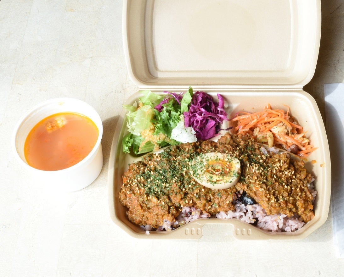 挽肉・九州味噌・国産生姜たっぷり使ったキーマカレー、酒粕の煮卵、野菜はキャロットラペ、