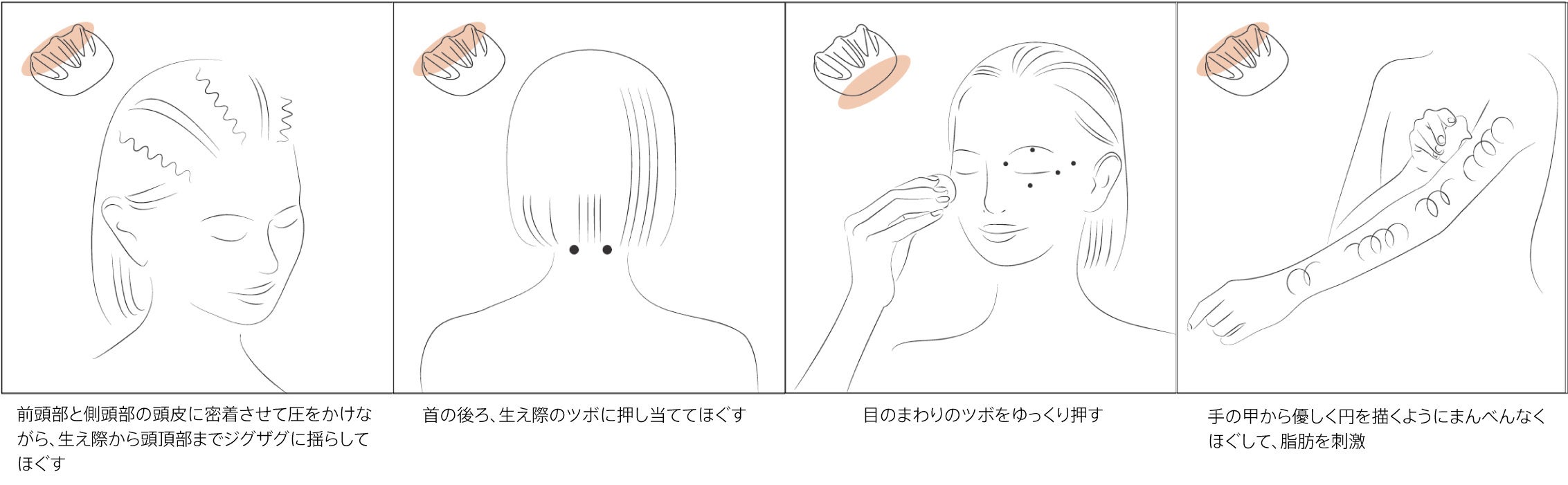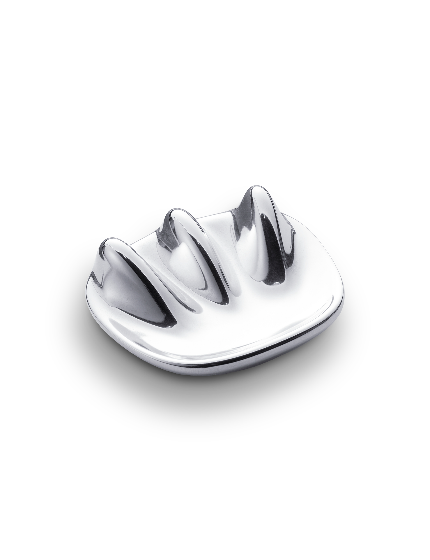 鏡面に磨き上げられた3つの突起を持つフォルムは、滑らせるような優しい押し当てと、指圧のような強い押し当ての両方が可能です。この特徴的なフォルムは全身へのアプローチにも適しており、脂肪への刺激などにもお使いいただけます。