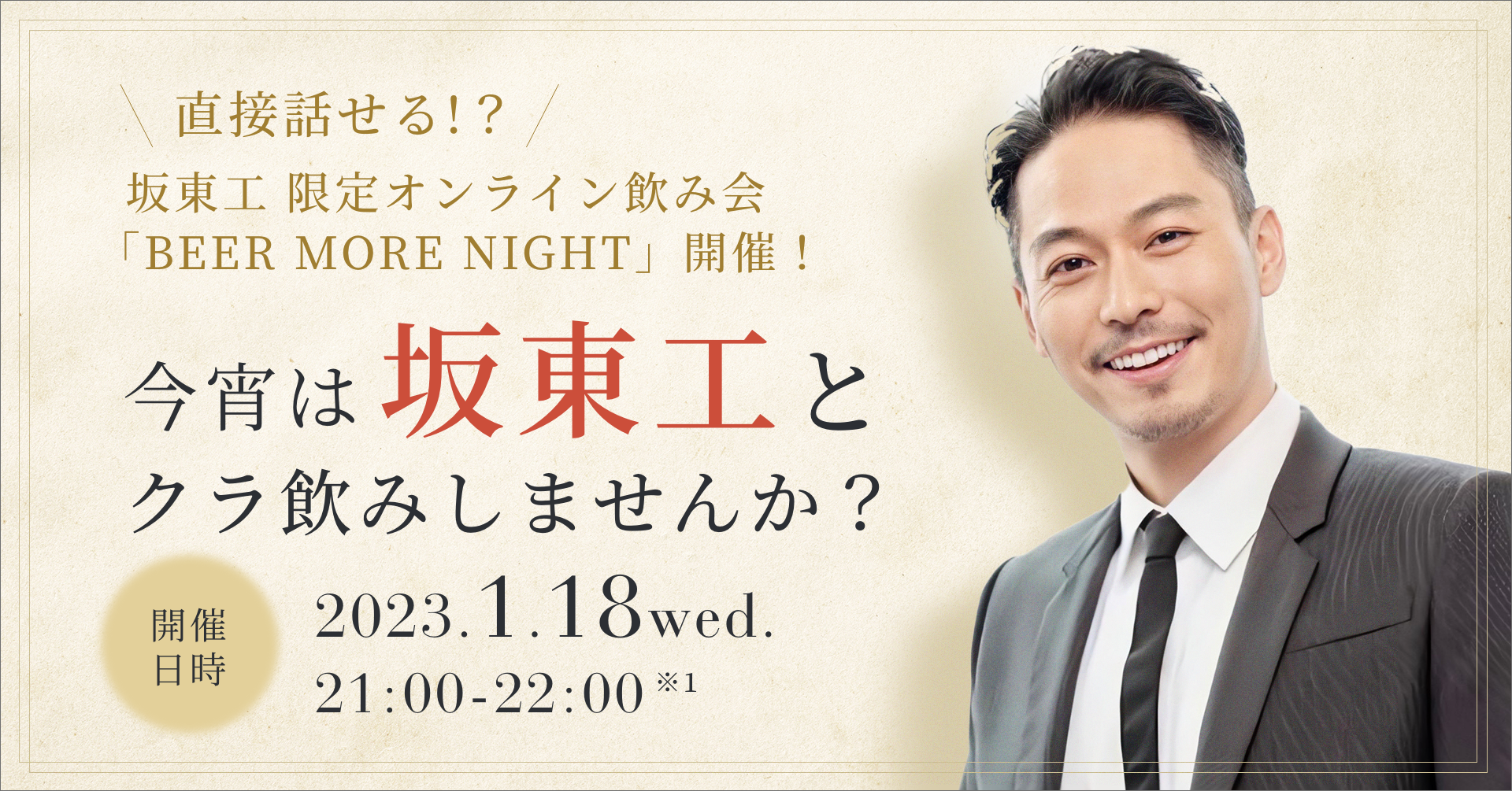 俳優・ナレーター・アーティスト・起業家とマルチな才能を持つ一方、プライベートでは熱心なクラフトビールラバーでもある「坂東工」さんをゲストに迎え、BEER MOREユーザー限定のオンライン飲み会を開催します。お仕事や勉強、家事を終えた大人の時間、ビアモアの厳選クラフトビールを味わいながら坂東さんのイケ渋ボイスに耳を傾ける上質なひとときをお楽しみください!