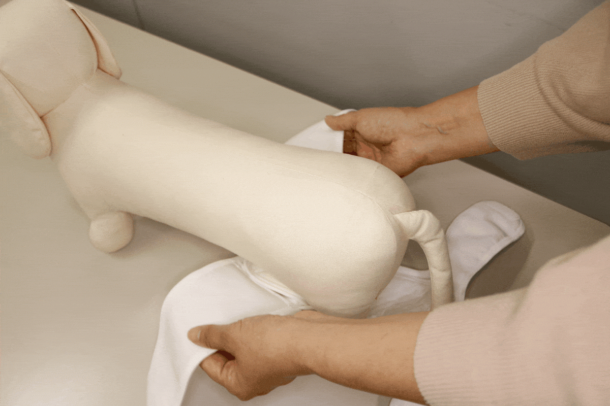 形は着脱のしやすさにこだわって設計しました。ワンちゃんは立ったままでOK!しっぽを触ったり足をあげたりする必要がなく、簡単3ステップで着用できます。※意匠登録出願中
