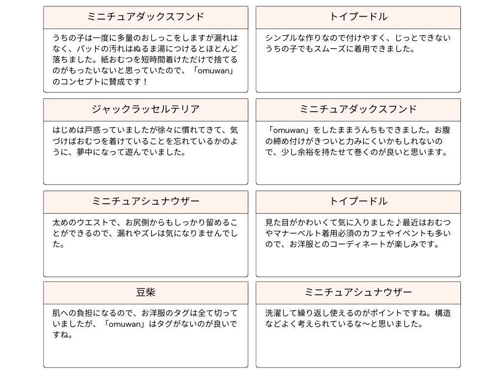 開発モニターをしてくれたワンちゃんや、試着会に参加してくれたワンちゃんの飼い主さんの声をお届けします。