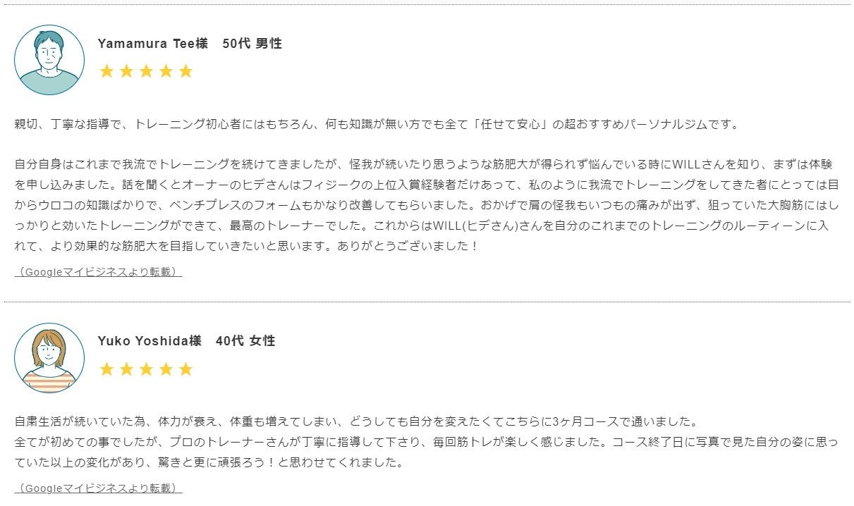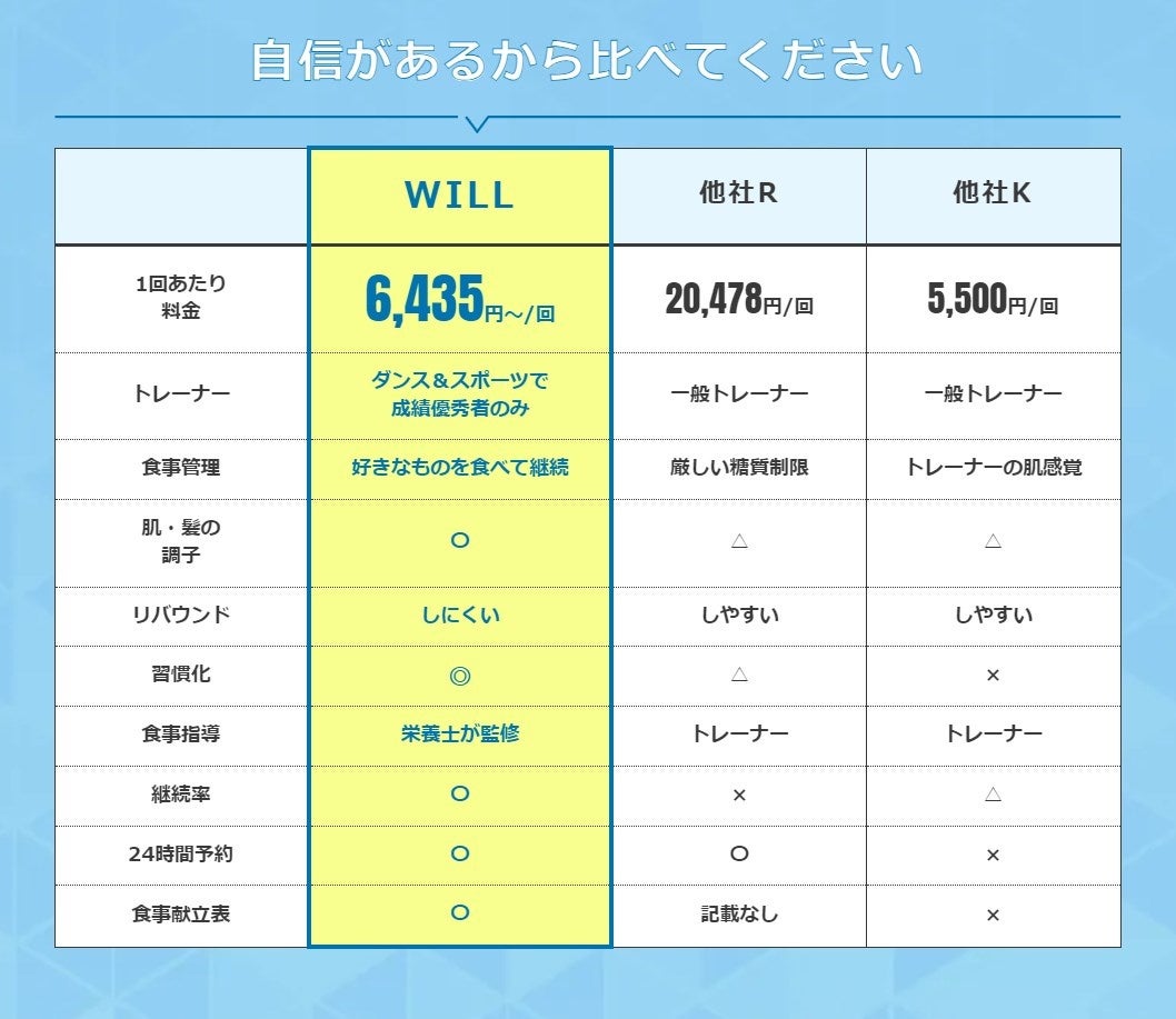 そのほか、様々な経歴を保有する経験豊富な一流トレーナーから完全個室指導を受けられる点や、地域クチコミ数No.1という事実も合わせて、WILLパーソナルジムのサービス満足度の高さがうかがえます。