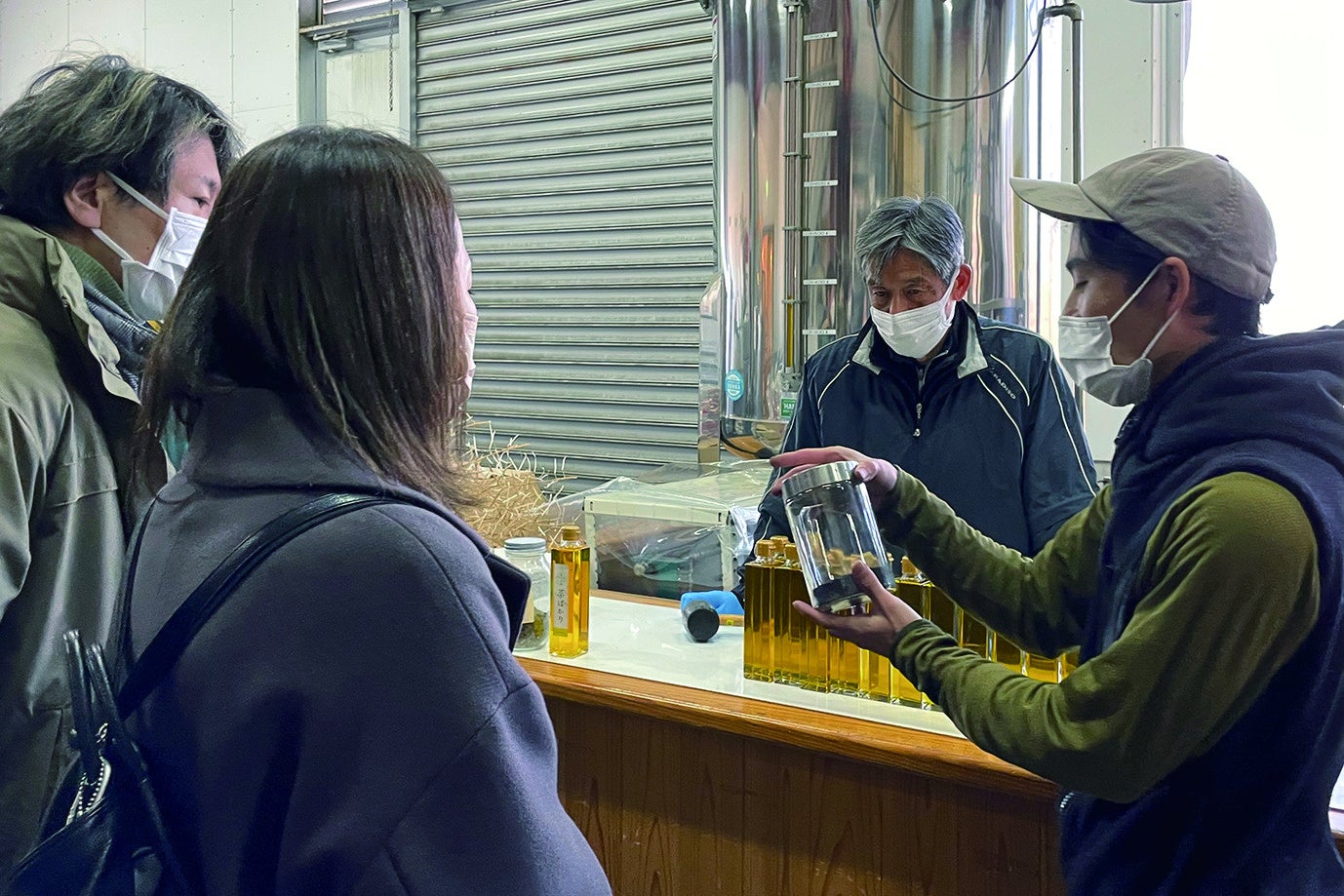 地域の課題に地域で主体的に取り組む事業の拠点(例:廃食油から粉せっけん、バイオディーゼル燃料を生み出すなど資源循環型事 [人, ワイン, 男, 立つ が含まれている画像 自動的に生成された説明] 業を組み合わせた「あいとうエコプラザ菜の花館」)や、独自性の高い商品で「三方よし」を実現するものづくりの現場(例:高品位なデニム製品を販売し、長く使うための修理やカスタムサービスも提供する「FORTY NINERS」)を訪ねます。