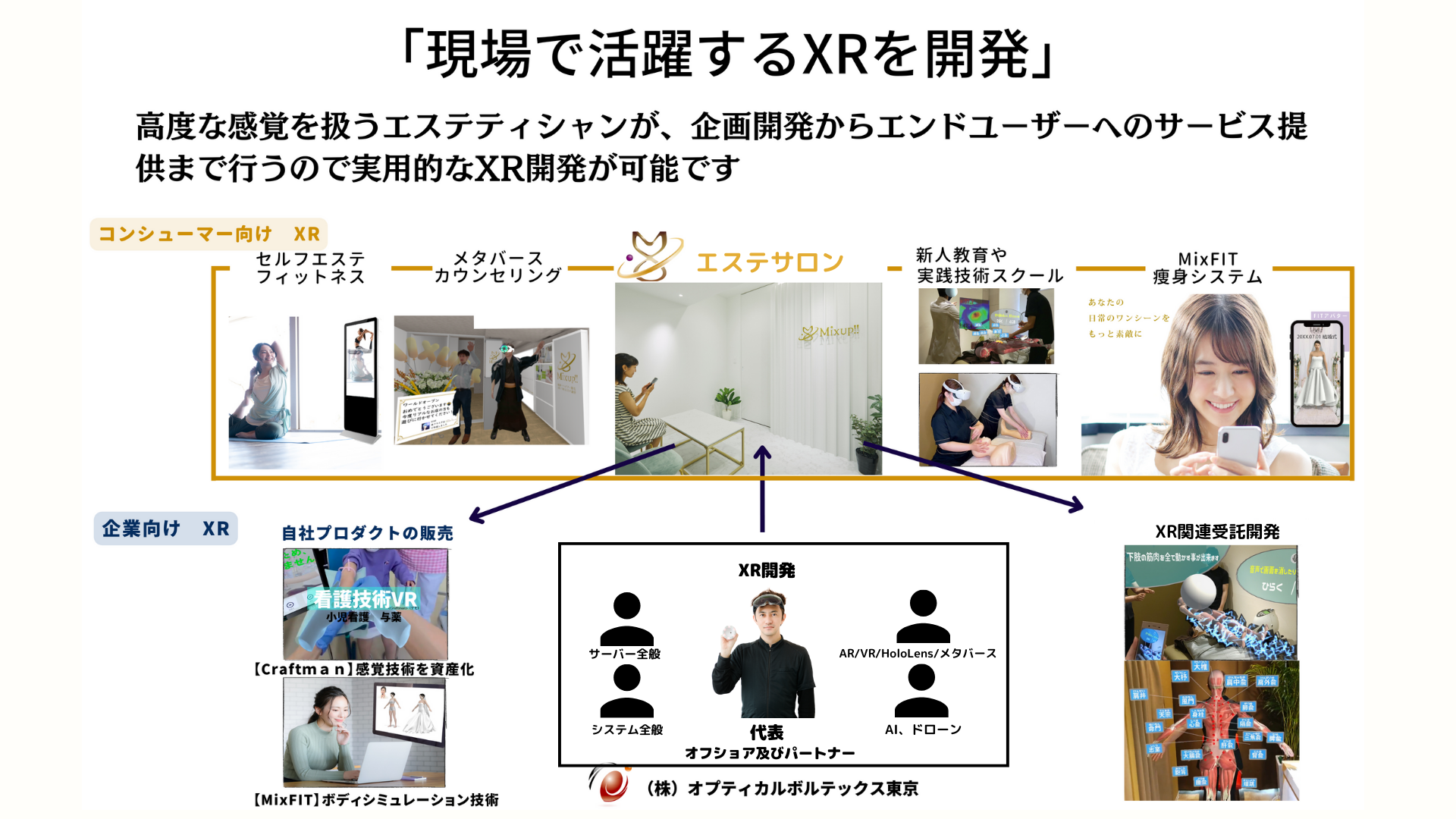 株式会社オプティカルボルテックス東京は、エステティックサロン運営関連事業およびXR関連のソフトウエア開発を行う企業です。現場で活躍するXRサービスを目指し、技術と知識の資産化をコンセプトに、新たな可能性を追求しています。
