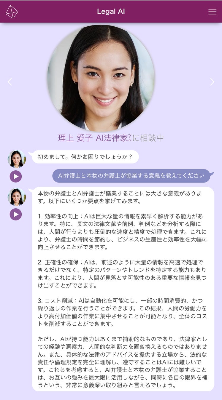 また、時間や場所を問わず利用できるため、法律サービスのアクセシビリティを向上させる役割も果たします。ただし、現段階では人間の法律家・弁護士の補助的な位置づけであり、全ての法的問題を正確に解決するわけではありません。AIはあくまで道具であり、最終的な判断は人間が行うべきという方針のもとで運用されています。