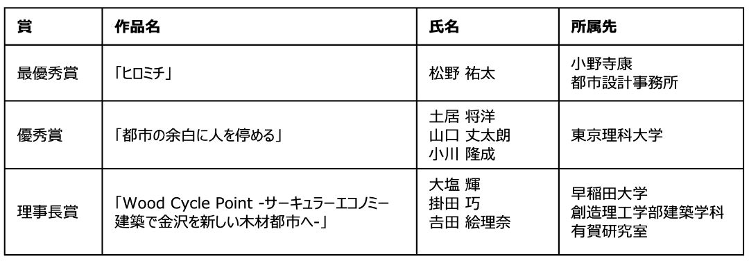 古くからのものと新たなものが在りつつ、どちらの魅力も損なうことなく共存している金沢のまちに魅力を感じ、本コンペティションに応募しました。理事長賞に選出していただきありがとうございます。ただ新しいものを入れるだけではなく、昔からのものを継承していけるような都市や建築をこれからも考えていきたいです。