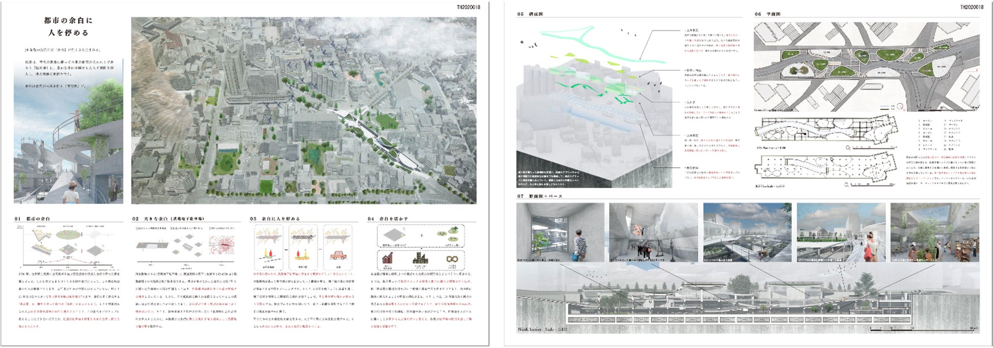 新しい交通と都市の中での動き⽅という着眼点は⾯⽩い。⼀⽅で、⾦沢のまちとどういう繋がりを持った計画なのかという提案が弱い。このスケール感で、この⼤きな商業施設をまちなかに作ることは果たしてどうか、再考してみていただいたら何か⾯⽩いことになるのでは。スケール感、中に⼊るプログラム、元々あるものを残すのか、そのあたりを総合的に判断できたらもう少し説得⼒があったようにも感じる。<⽯上 純也⽒>