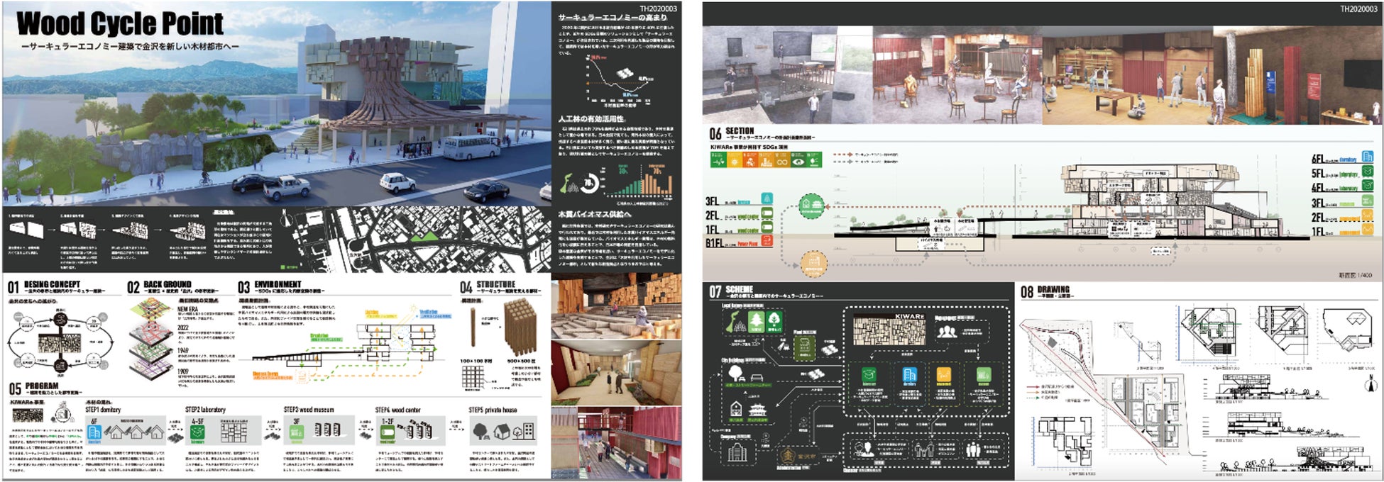 石川県に多く存在する森林資源を活用した研究やサーキュラーエコノミー建築の実践等を行うことで、金沢を木材都市とし、木材を通じた新しい賑わいを創出する。本提案では、能登半島などの間伐材を通じた大きなサーキュラーエコノミーの輪と、金沢周辺の民家などを巻き込んだ小さなサーキュラーエコノミーの輪を描き、それらの輪の中心となる建築を設計している。