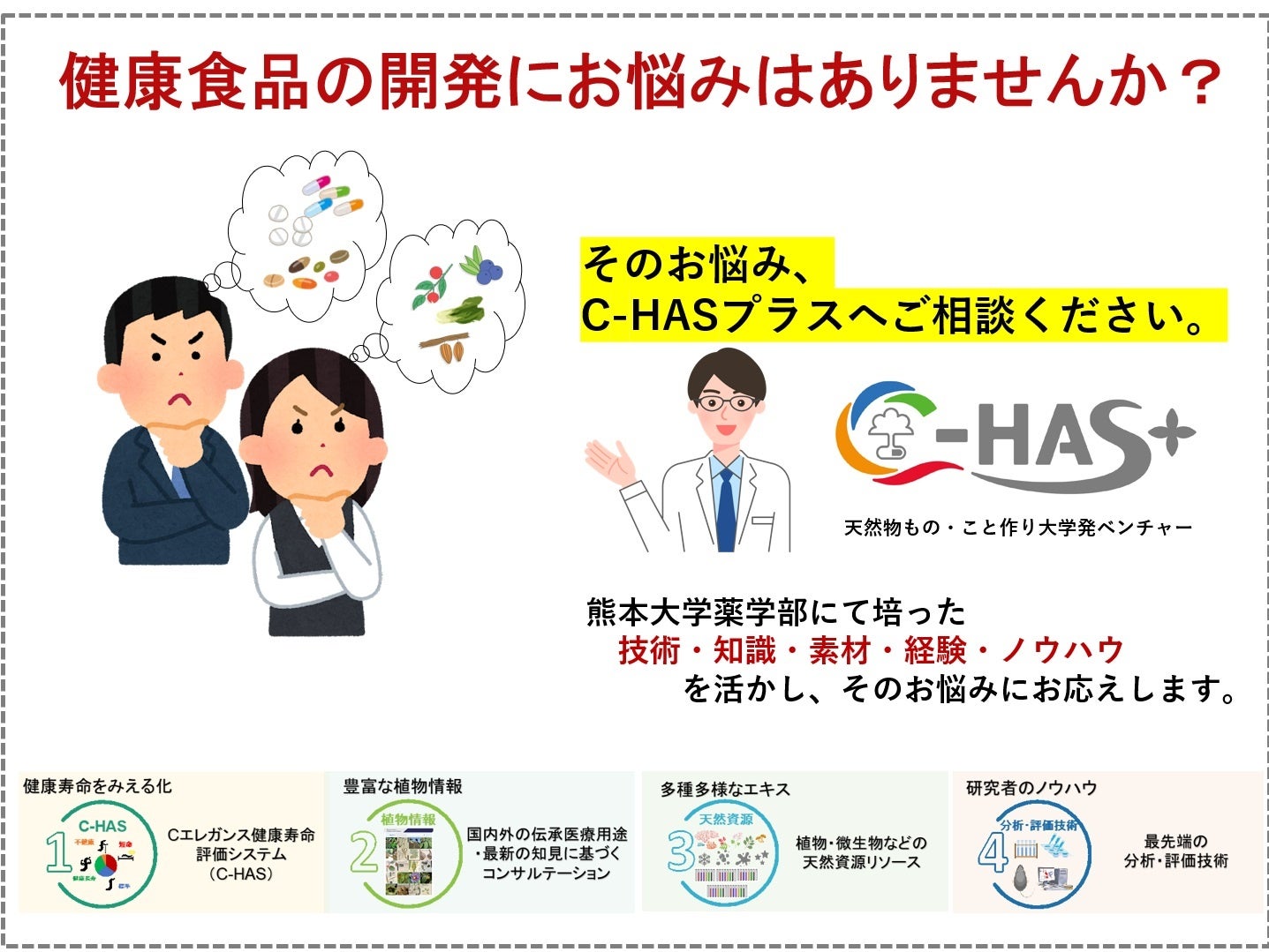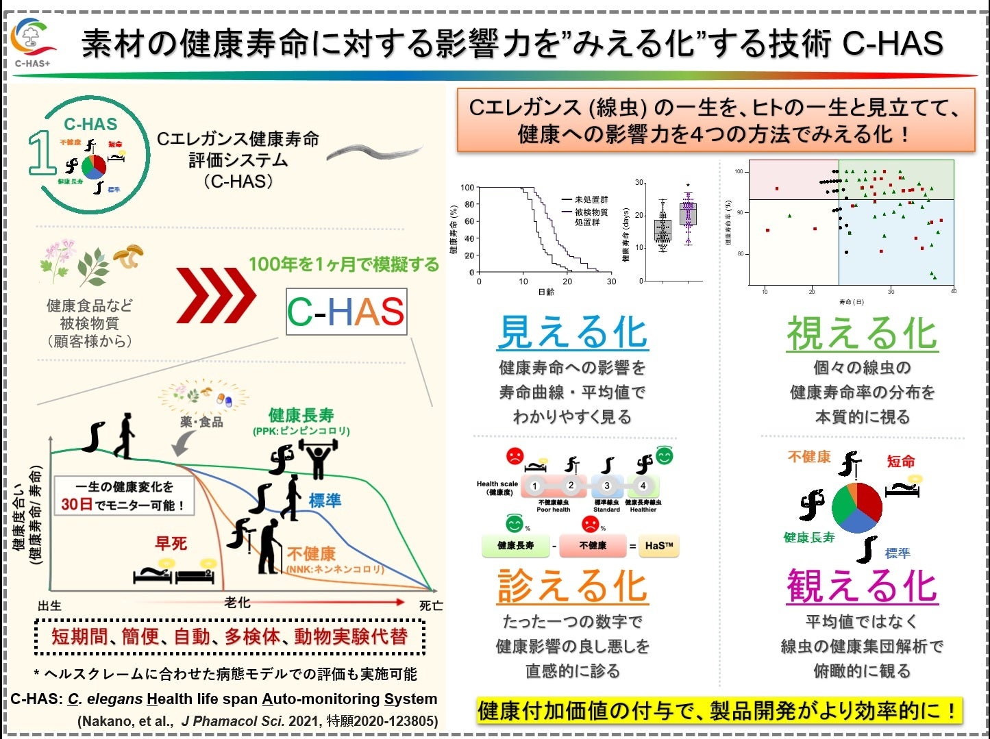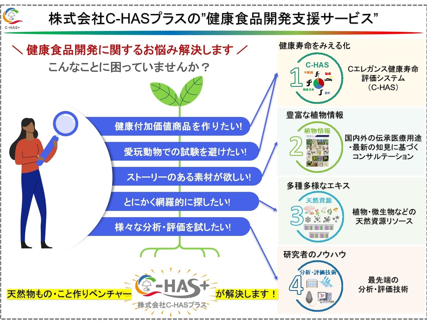株式会社C-HASプラス(本社:熊本県熊本市、代表取締役CEO:菊池正彦、取締役社長COO 首藤 剛)は、食品開発展2022へ出展し、健康食品開発支援サービス事業(①Cエレガンス健康寿命評価システムC-HAS、②国内外の伝承医療用途・最新の知見に基づくコンサルタント、③植物・微生物などの天然資源リソース、④最先端の分析・評価技術)についてご紹介します。