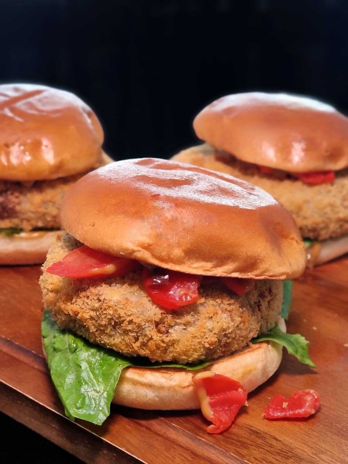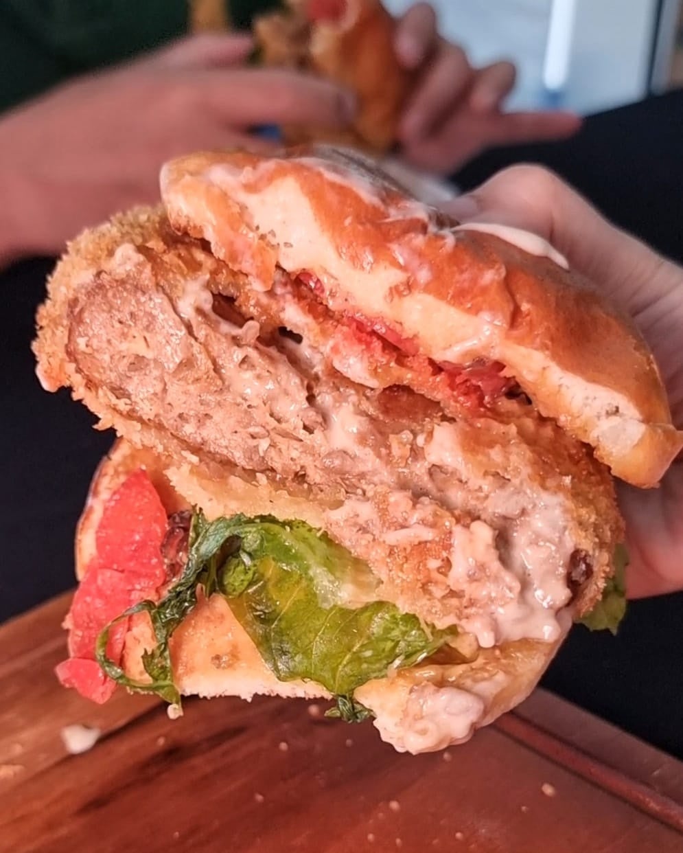 豆乳クリームが中に入ったチーズハンバーグ様のNIKUVEGE豆乳クリームinハンバーグをメンチカツ風に揚げ、カレー風味のソースとバンズにサンドしました。オーダーが入ってから調理を行うので、揚げたてのサクサクとした食感を楽しむことができます。