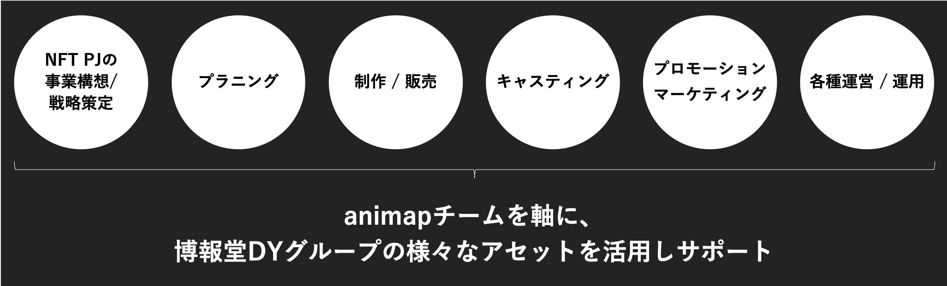 また、博報堂DYメディアパートナーズ内で、NFTビジネスにおける戦略立案、プラットフォーム開発、外部マーケットプレイスとの連携、マーケティングやクリエイティブ、法規制対応、今後のメタバース展開など新たなサービスやプロダクトを専門チームとして創出していくプロジェクト「Play Asset」が発足され、「animap」チームも連携しています。