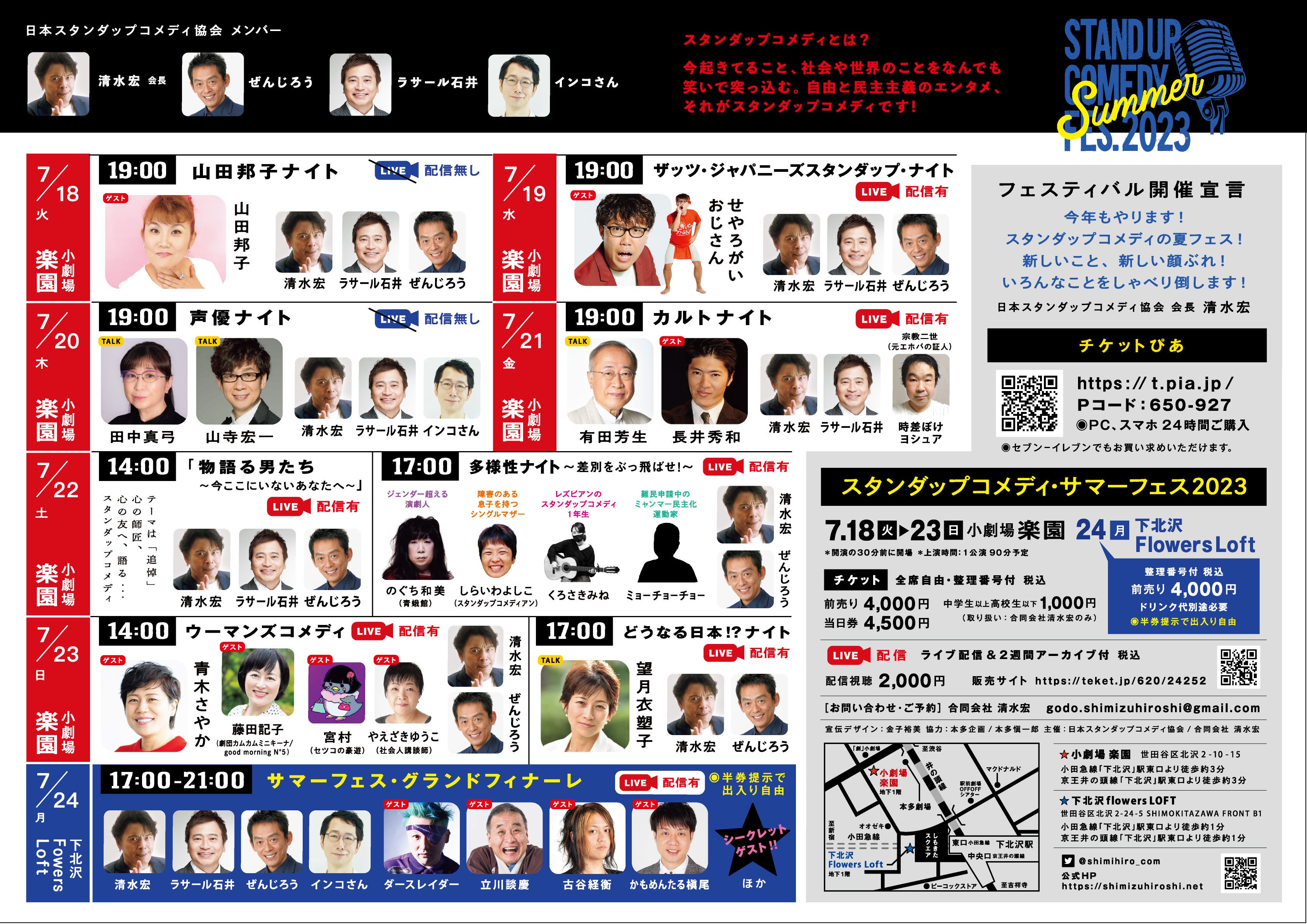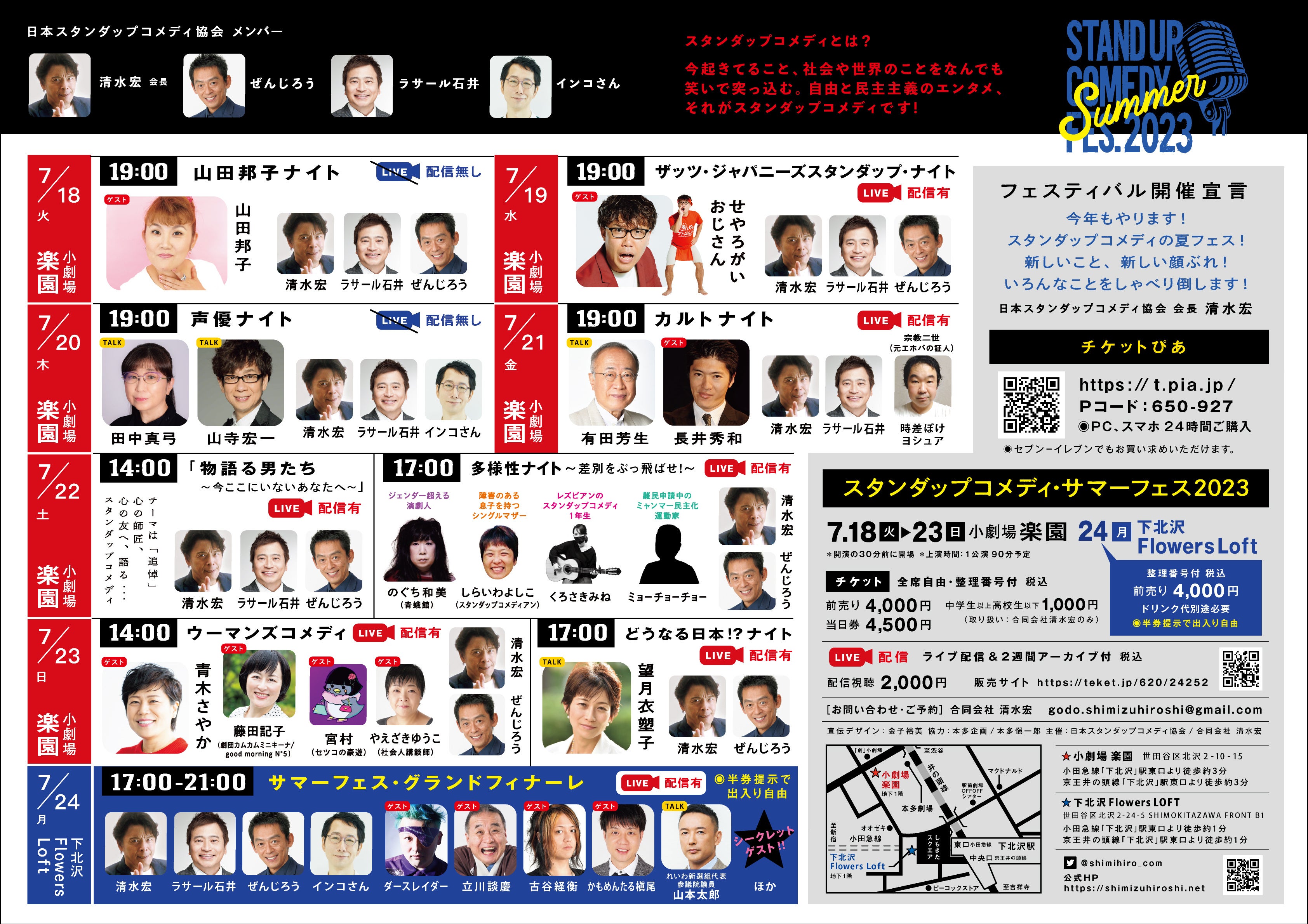2023年7月18(火)~24(月)の7日間、東京下北沢にてスタンダップコメディ・サマーフェスティバルを今年も開催します!今起きてること、日本の社会や世界のことをなんでも笑いで突っ込む、自由と民主主義のエンタメ!それがスタンダップコメディ!ラインナップは日本スタンダップコメディ協会のメンバー、清水宏、ぜんじろう、ラサール石井、インコさんの4人に加え、山田邦子のものまねスタンダップコメディ、せやろがいおじさんと共にお見せする”日本のスタンダップコメディ最前線”、声優界からレジェンド田中真弓、山寺宏一も参戦!有田芳生、長井秀和を迎えて、テレビでは話せない”あの宗教”の話と宗教2世による貴重なネタも炸裂。「物語る男たち~今ここにいないあなたへ~」と題して、志村けんや上岡龍太郎など、心の師匠への追悼人情話をラサール石井、清水宏、ぜんじろうが披露し、議論を呼んでいる”多様性”をテーマにした社会派スタンダップコメディ、国籍・ジェンダー・障害、差別を笑いでぶっ飛ばす!ウーマンズコメディでは青木さやかがスタンダップコメディに挑戦!ジャーナリストの望月衣塑子を迎えて話題のあの事件と日本のタブーを斬りまくり!フィナーレではダースレイダー、古谷経衡、立川談慶、かもめんたる槇尾の多種多様なメンバーに”ここだけ”のシークレットゲスト。と、何が起こるか未知の世界のサマーフェス!ライブ配信にも挑戦して地方のスタンダップコメディのファン拡大など、今年も様々な趣向でお客様に満足してもらいます。 スタンダップコメディを日本に広めるため私たちは日々精進して参ります。 まずは、サマーフェス2023に是非、お越しください!お待ちしております!