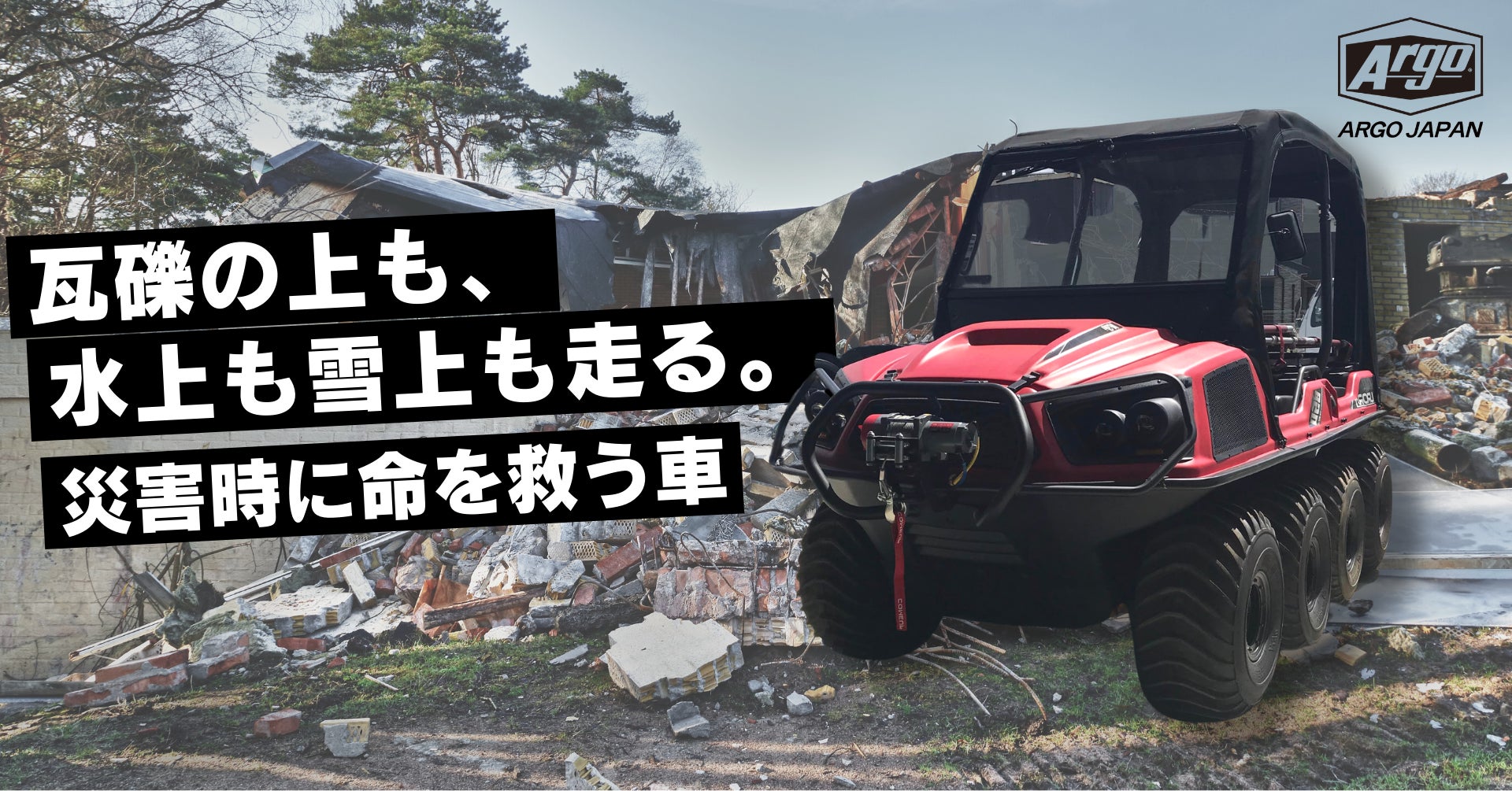 陸上、水上、雪上すべてで走行可能。高い操作性で災害時の人命救助や物資支援に役立つ水陸両用車