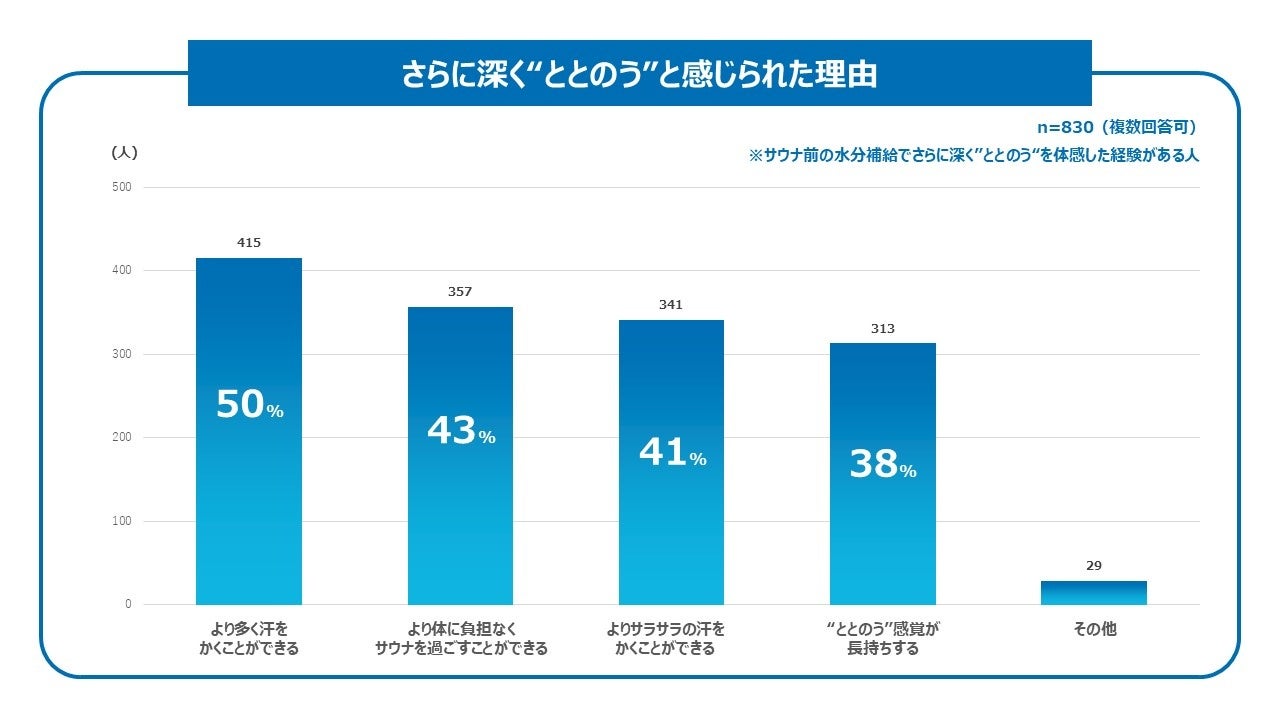 サウナファンを対象にした調査(※1)によると、サウナに入る前に水分補給をした人の76%が、普段よりも「さらに深くととのう」と回答しました。その76%の人に「サウナに入る前の水分補給によって得られる体験」を聞いたところ、50%の人が「より多く汗をかくことができる」、43%の人が「より体に負担なくサウナを過ごすことができる」、41%の人が「よりサラサラの汗をかくことができる」と回答しました。
