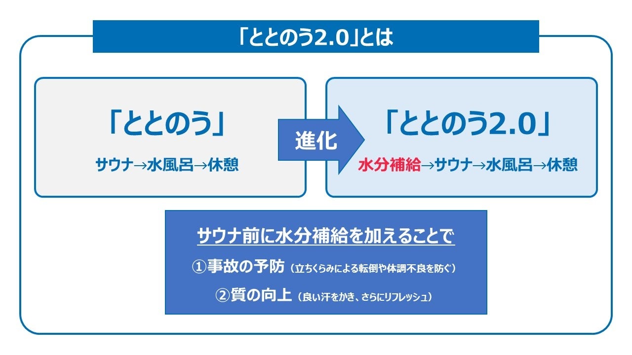 「ととのう2.0」は、事故を予防しサウナ浴の質を向上させるため、サウナに入る前からの水分補給を加えた新ルーティン、「水分補給・サウナ・水風呂・休憩」の4ステップを1セットとして推奨していきます。