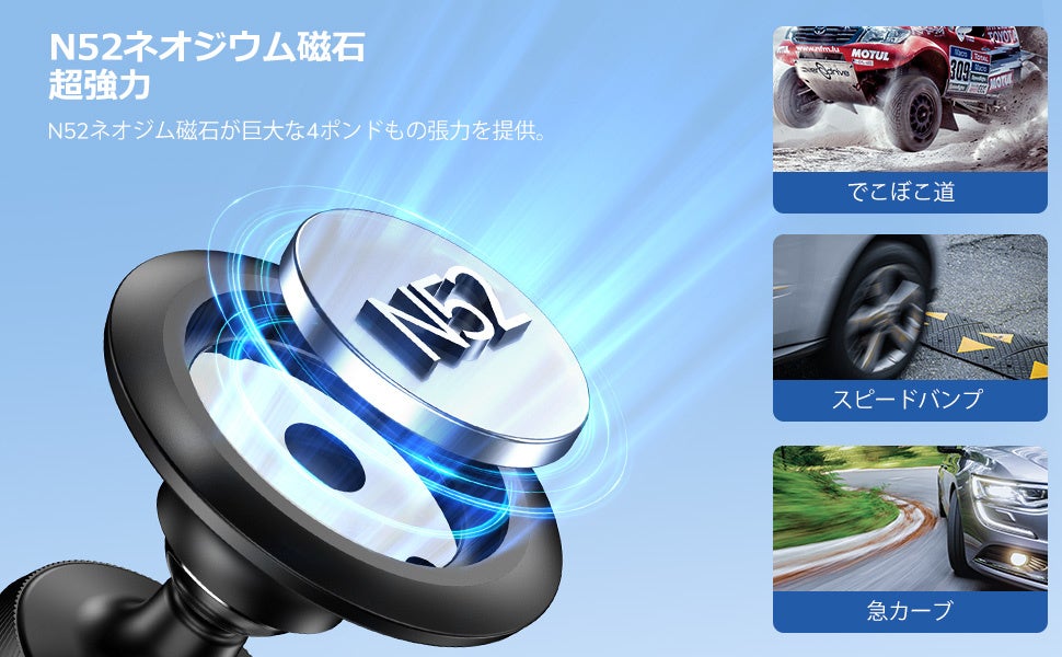 【超強力磁石】1.第4世代のネオジム磁石を採用、信頼性の高い3M VHB粘着パッドが強力な粘着力を発揮します。2. アップグレードした回転クリップは、通気口にしっかりと固定できます。急ブレーキ、スピードバンプの通過、険しい山道での運転など、様々な状況で安定した状態を保ちます。