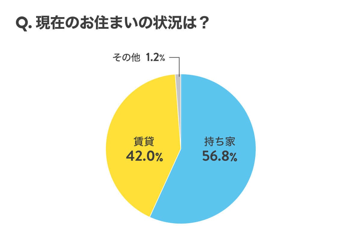 上記の3択で伺ったところ、持ち家と答えた方が56.8%と、全体の6割近くを占めていました。