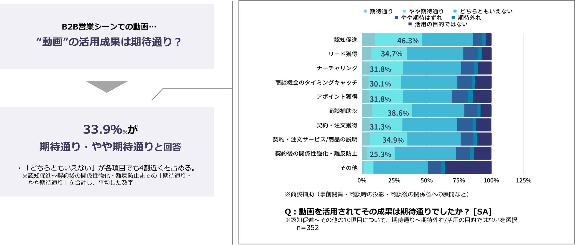 ・ 33.9%が動画の成果を“期待通り・やや期待通り”と回答。認知促進に関する成果が期待通りと回答される割合が高い(46.3%)