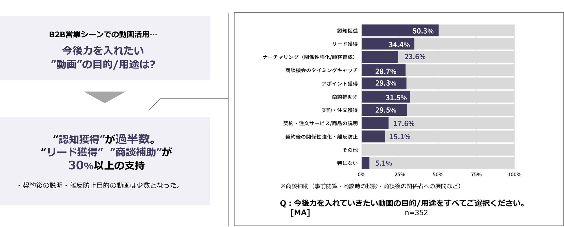・ 今後力を入れたい動画の目的は、認知促進が50.3%、次いでリード獲得、商談補助となった