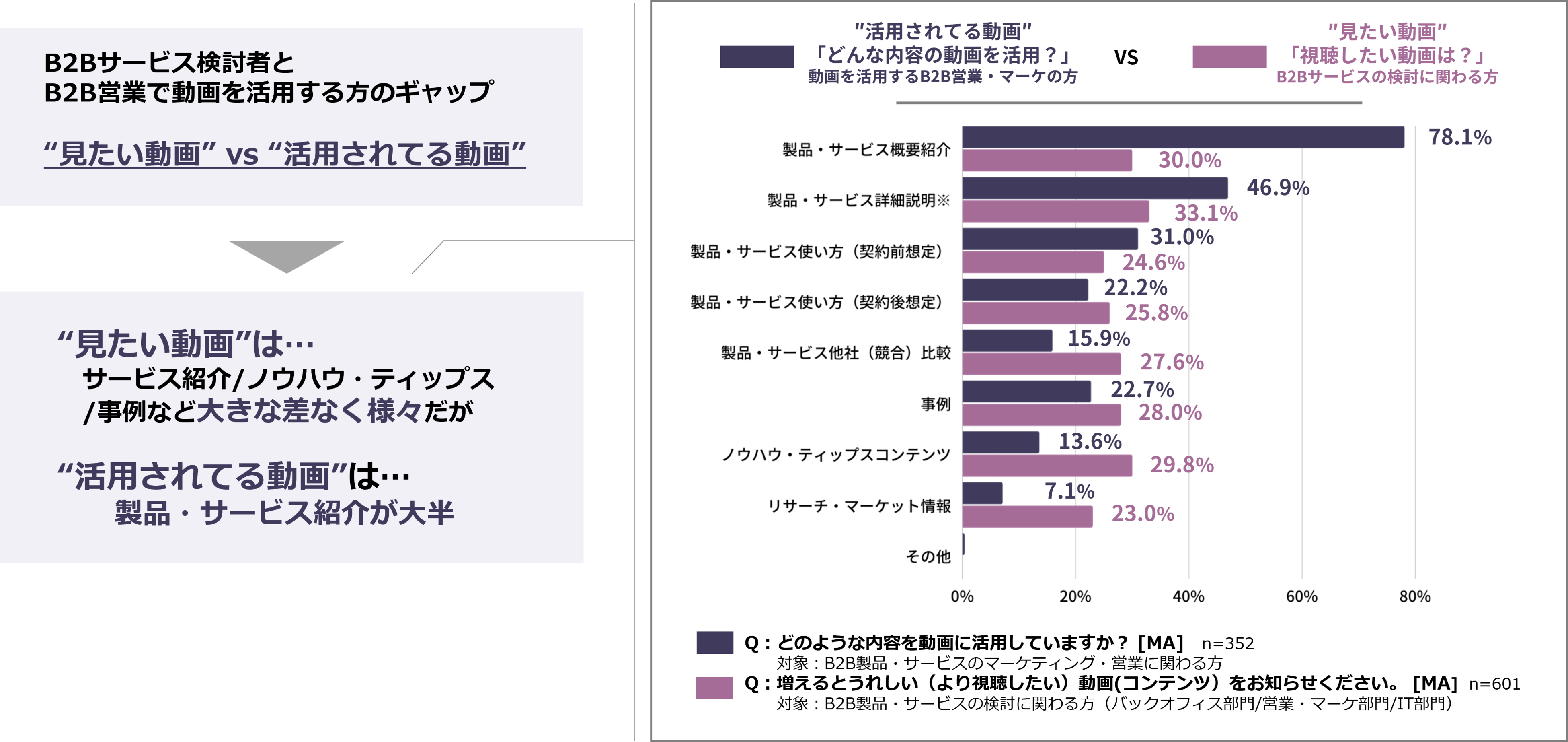 2022年7月に公開した「B2B製品・サービス検討にかかわる方の動画視聴調査」に次ぐ今回の調査によって、“見る側”=B2B製品・サービス検討者と、“見せる側”=動画施策を実施するマーケ・営業とのギャップが明らかになりました。