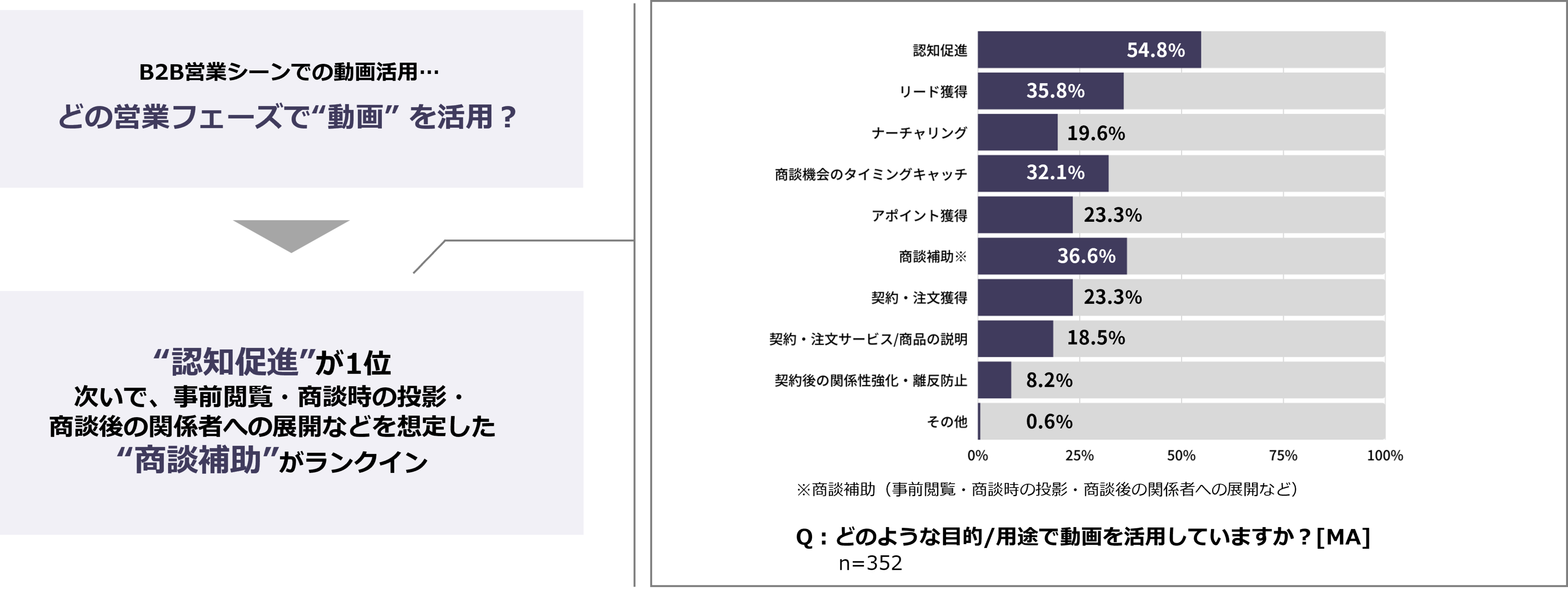 ・ 54.8%の方が“認知促進”、36.6%の方が“商談補助”の目的で動画を活用する