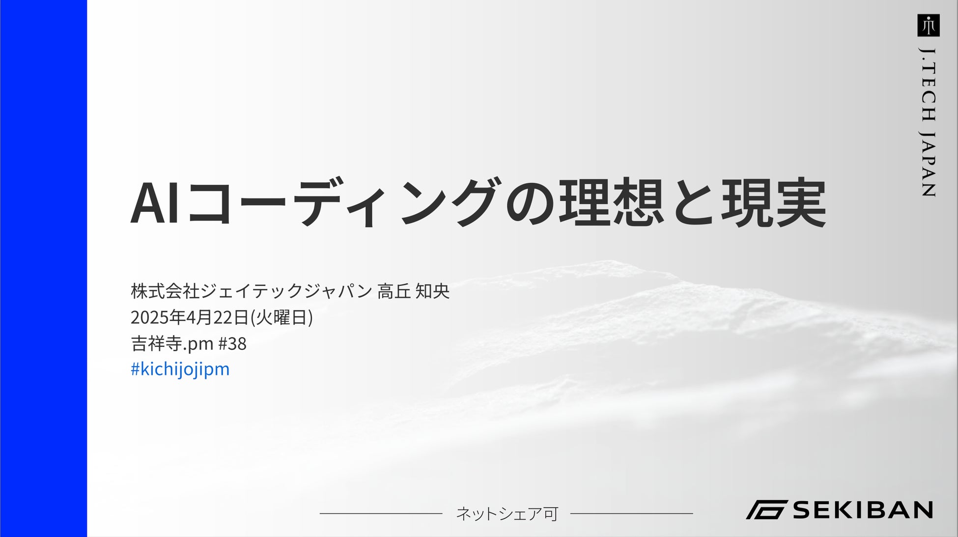 イベントソーシング/DDD サポートと併せて、ジェイテックジャパンは AI コーディング活用 に関するコンサルティングも行っています。CTO 高丘知央(Microsoft MVP)は 2025 年 4 月、吉祥寺.pm での講演「AIコーディングの理想と現実」で Copilot や Cline の実践例を紹介し、ITmedia NEWS などでも取り上げられました。生成 AI を取り入れた開発生産性の向上にご関心の企業様は、ぜひご相談ください。