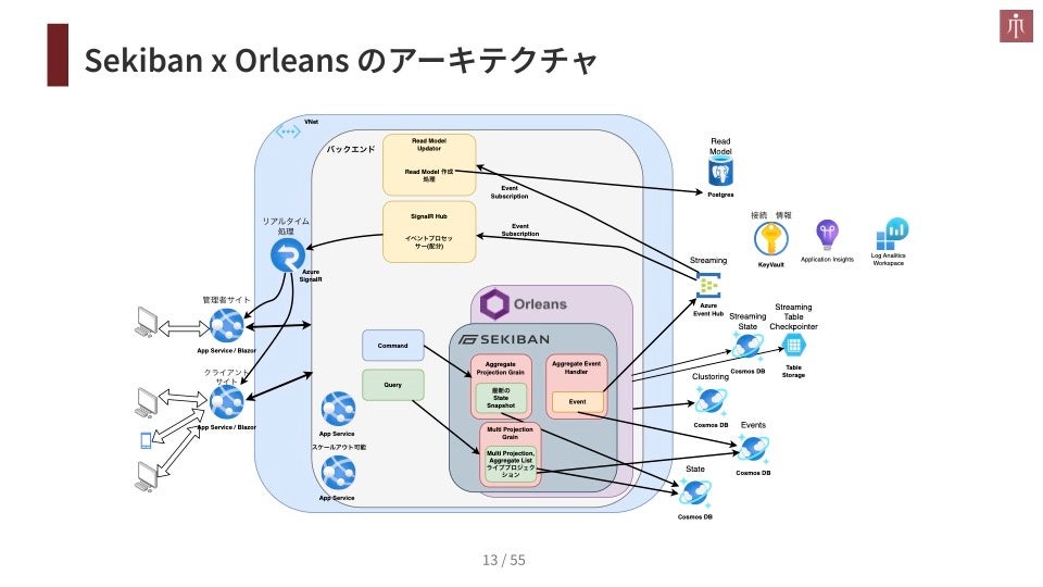 Sekiban と Microsoft Orleans におけるデータの流れと、Azureのコンポーネントの関係を図解して説明しました。