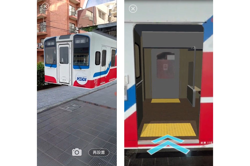 ①au XR Doorアプリをインストールしたスマートフォンを空間にかざすと、AR技術で地面を認識し、画面上に三陸鉄道のCG車両が出現します。