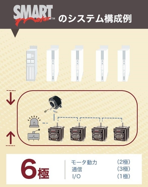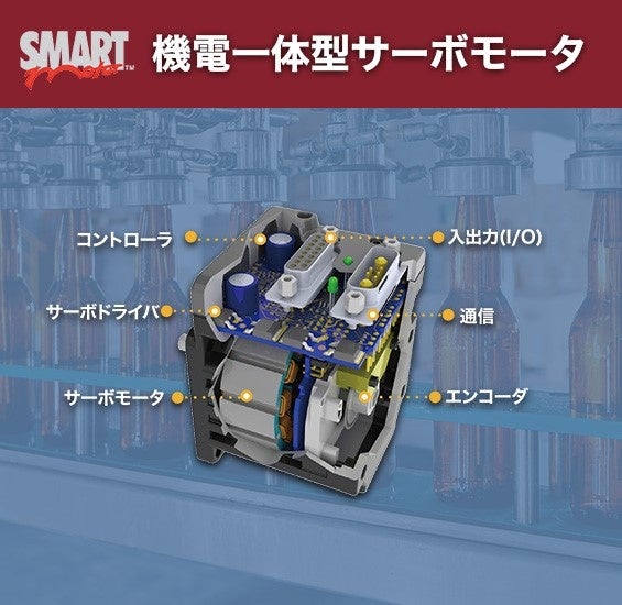 スマートモータとは、コントローラ・ドライバ・エンコーダ・入出力・通信が一体になったDCサーボモータです。