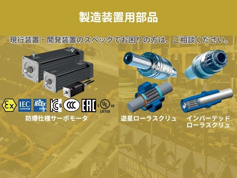 二次電池製造工程や水素関連設備向けにお問合せの多い「防爆仕様サーボモータ」や、ボールねじでは達成できないトルク、高加速、メンテナンス性で注目されている「遊星ローラスクリュ」、ムーグと言えばお馴染みの「油圧サーボ弁」を展示します。