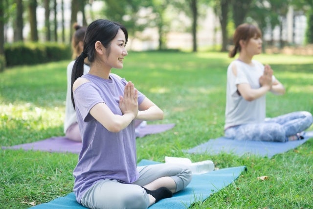 芝生のステージでは朝日をいっぱいに浴びる朝ヨガを体験することが出来ます。