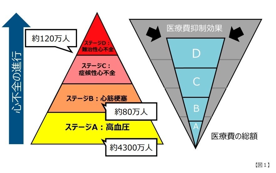 また、進行性の疾患である心不全(※図1)は、より早期からの抑制が重要とされ、進行が進むほど医療費が高額となるため、患者・国ともに大きな負担を強いられます。