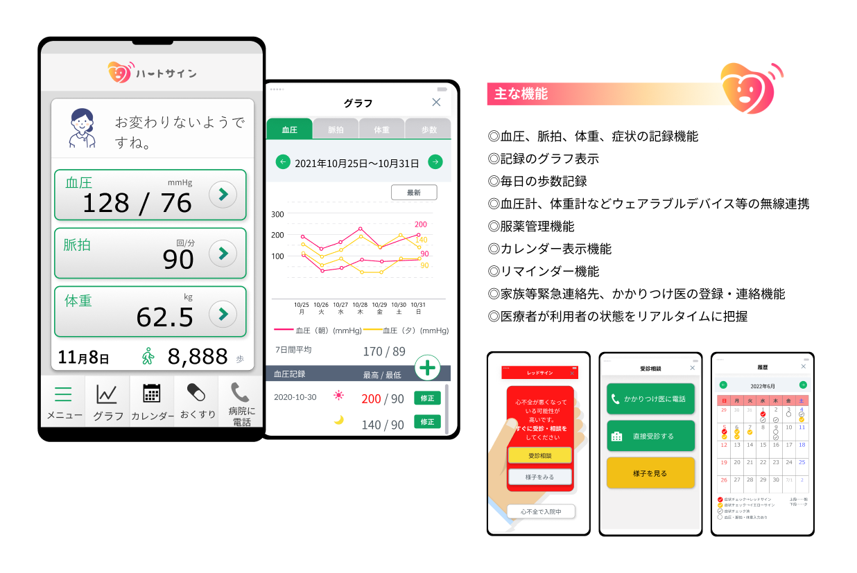 「ハートサイン」は2021年より開発を開始し、心不全患者の緊急入院を未然に防ぐ予後管理アプリとして、医療機器(SaMD)の可能性を視野に入れて研究開発を重ね、臨床研究を行っています。