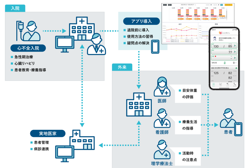 心不全患者や、高血圧等のリスクの高い方と医療機関をIoTで繋ぎ多職種連携による心不全管理を実施