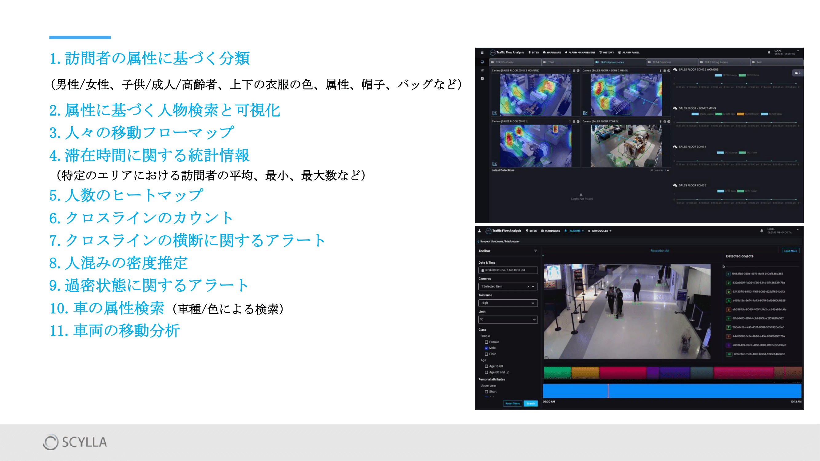 「危険物・侵入・万引き・人物検索・人流分析」などの検知を行う画像解析ソフトウェアSCYLLA(スカイラ)を出展
