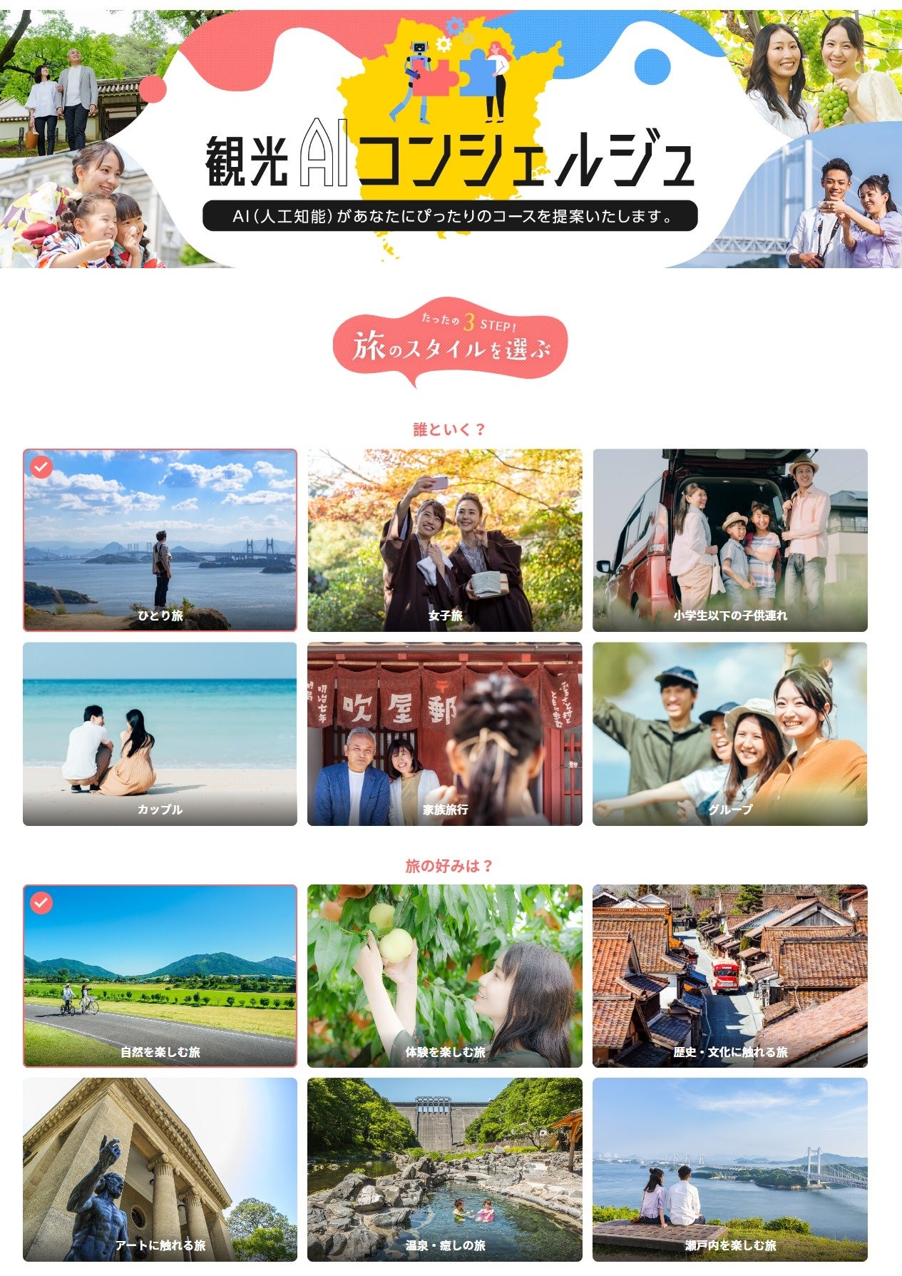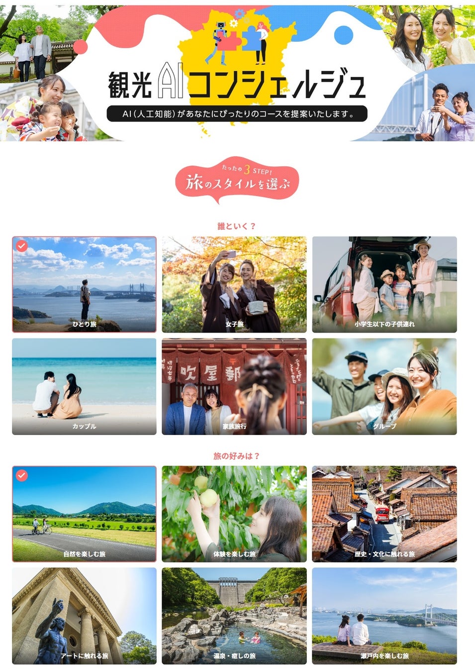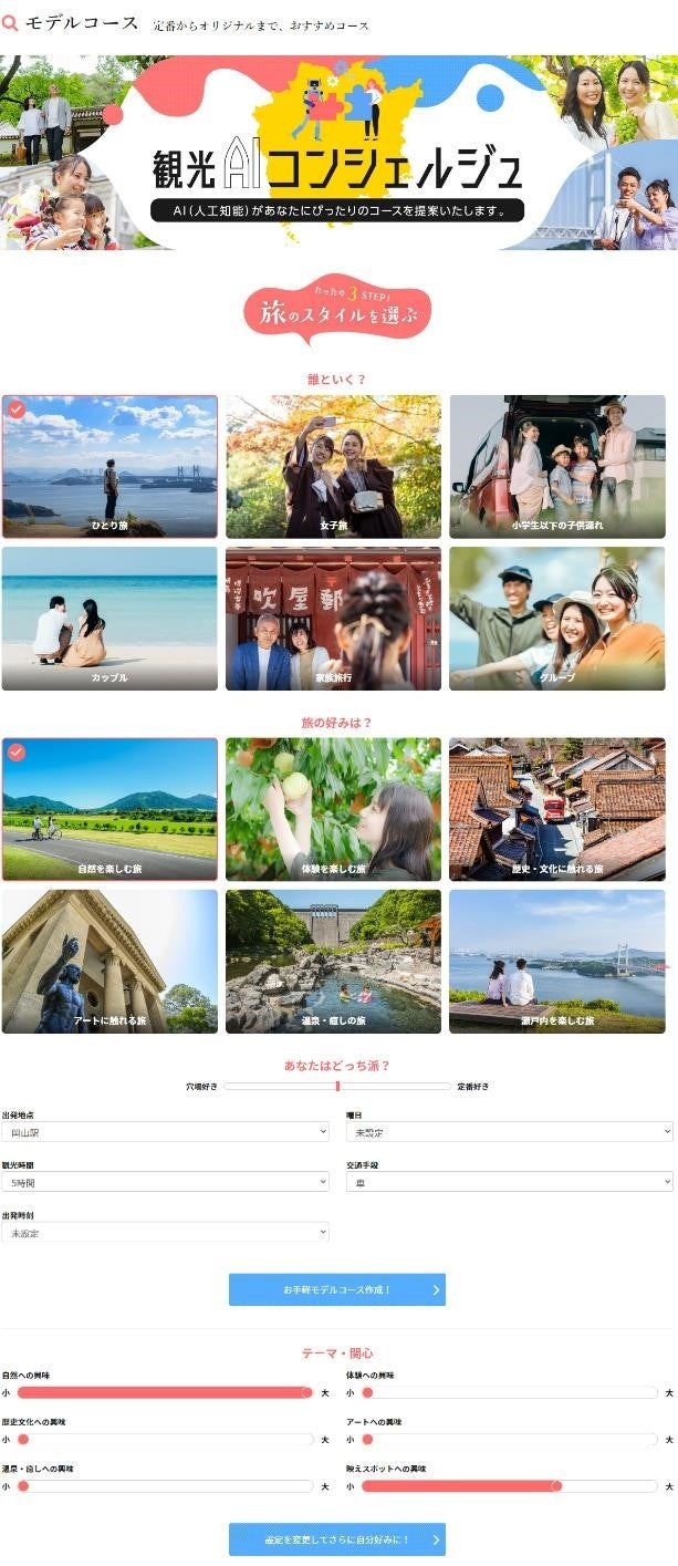 公益社団法人 岡山県観光連盟(所在地:岡山県岡山市北区、会長:石井清裕)は、コロナ禍でますます多様化する個人旅行のニーズに対応するため、県公式観光サイト「岡山観光WEB」のAIモデルコース作成機能をより進化させ、さらに自分好みにカスタマイズできる「観光AIコンシェルジュ」をはじめ、「観光マップ」「マイプラン」の3つの新機能の提供を開始しましたので、お知らせします。
