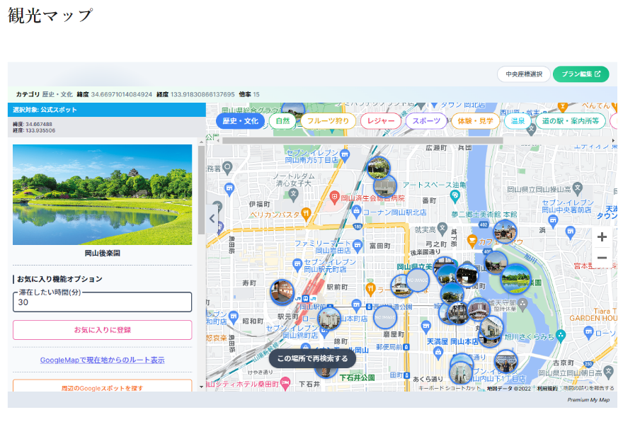 ・岡山観光WEBに登録されていない目的地周辺の飲食店等の情報も、googleマップ(googleビジネスプロフィールデータ)を活用し、観光サイト内で表示することができる。