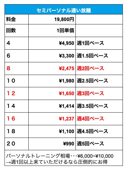 地域最安値の月額料金でセミパーソナル通い放題プランを導入することで1回あたりのセッション料金を更に抑えることができます。セッション料金が通った分だけお得になります。初心者から女性、お年寄りと老若男女問わず安心してパーソナルトレーニングを受けることができます。