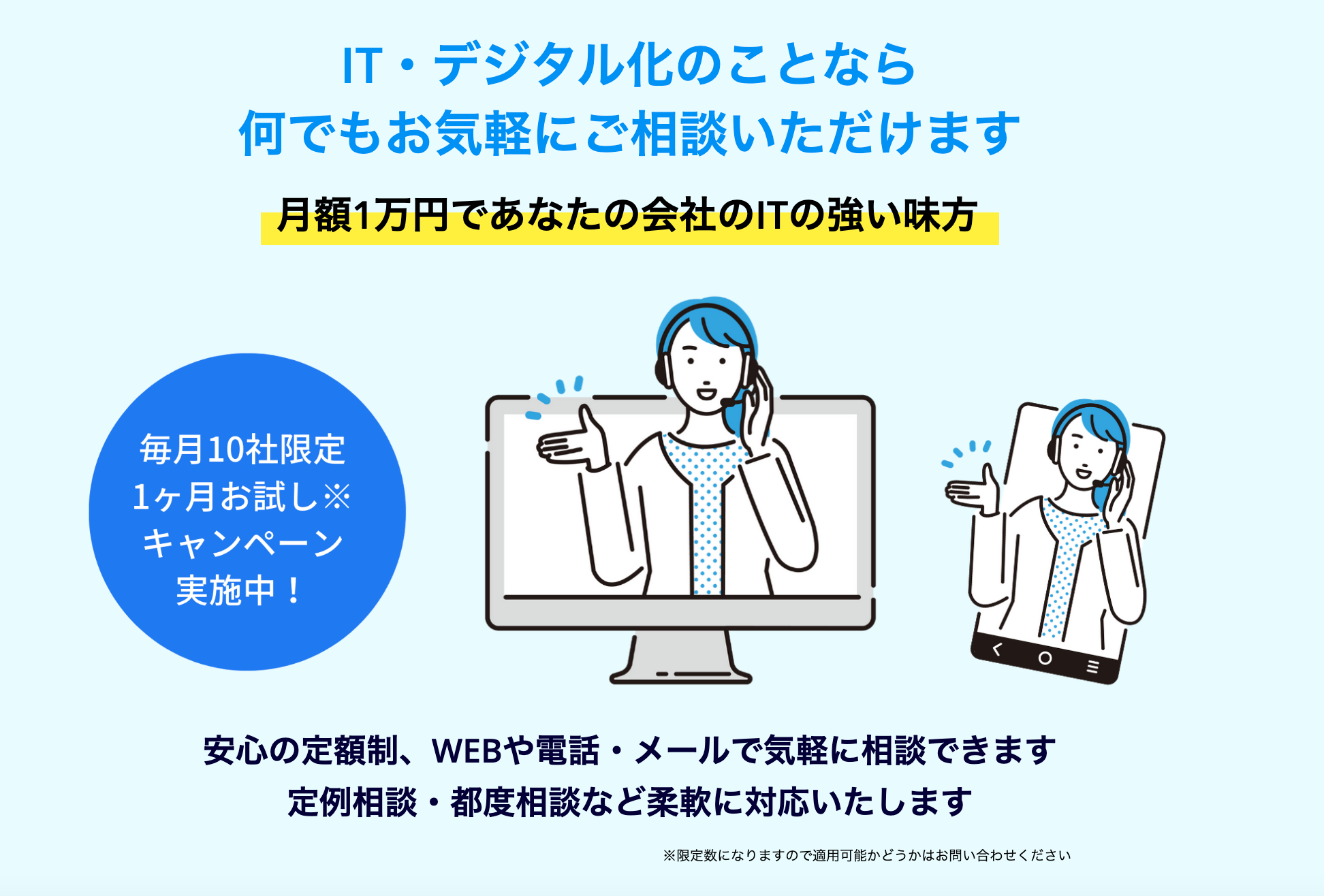 ITよろず相談・伴走支援サービスは、月額1万円の定額制です。あなたの会社のIT・デジタル化の伴走者として、定例であるいはお困りごとや課題が発生したときの都度相談など柔軟に対応できます。相談は対面やオンライン、電話やメールなどアクセスしやすい方法をご用意しております。ただいま、毎月10社限定の1ヶ月無料お試しキャンペーンを実施中(2024年3月末まで)です。ぜひこの機会をお見逃しなく!
