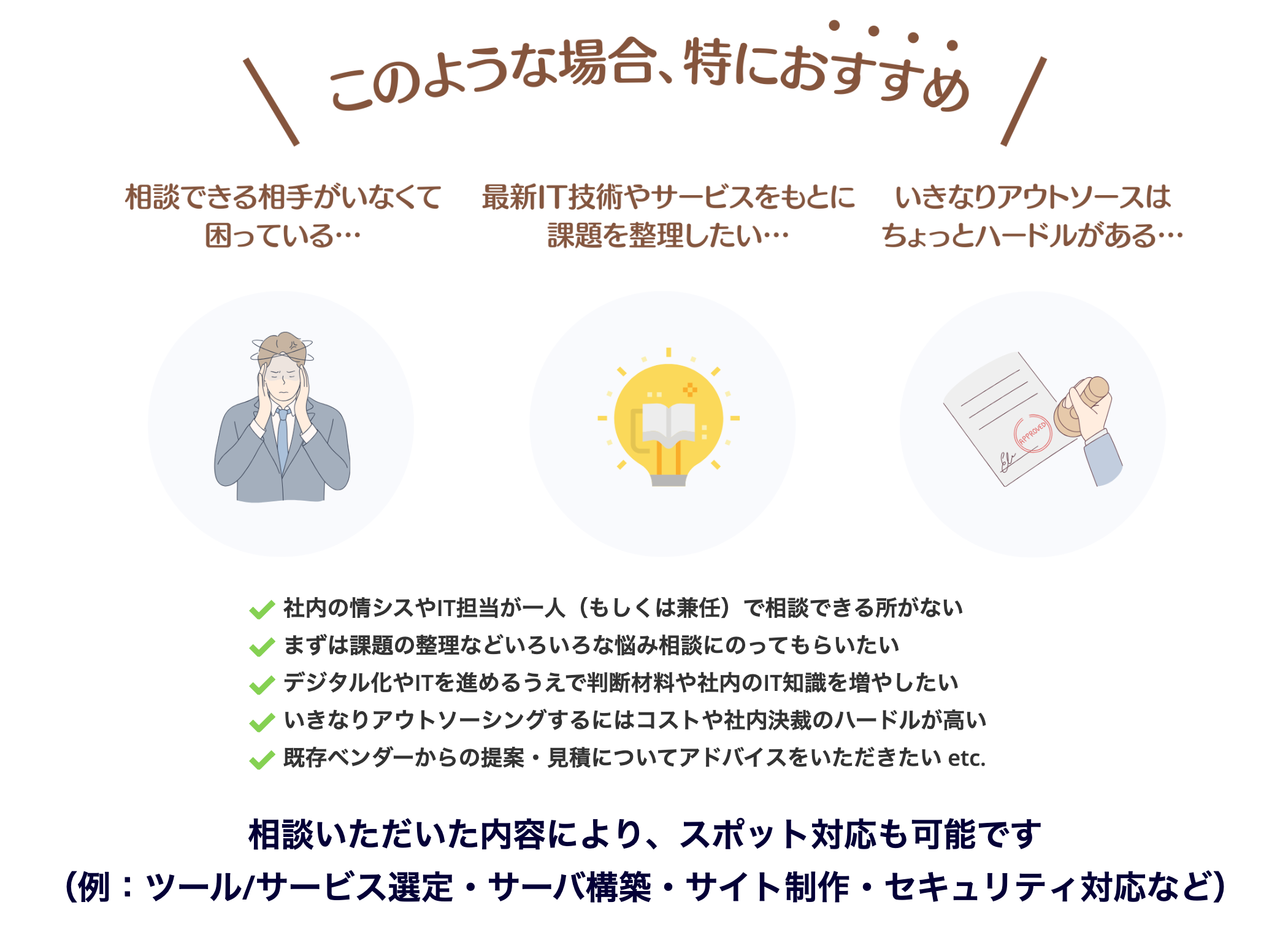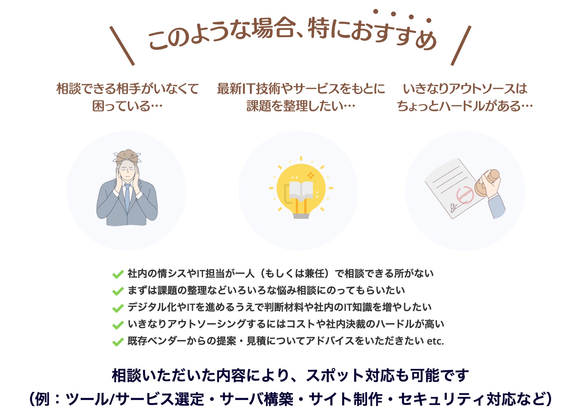 フレクシーサポートでは、情報システム代行(情シスアウトソーシング)をはじめ、ビジネスアプリ導入支援、ウェブシステムやサーバ構築、クラウド化、セキュリティ支援等に個別に対応するカスタム開発サービスなどを通じて、企業ITを支援しています。そのような中で、相談できる相手がいない、最新のIT技術やサービス知識をもとに課題の整理からはじめたい、いきなりのアウトソーシングはハードルもあるといった声もよく耳にします。