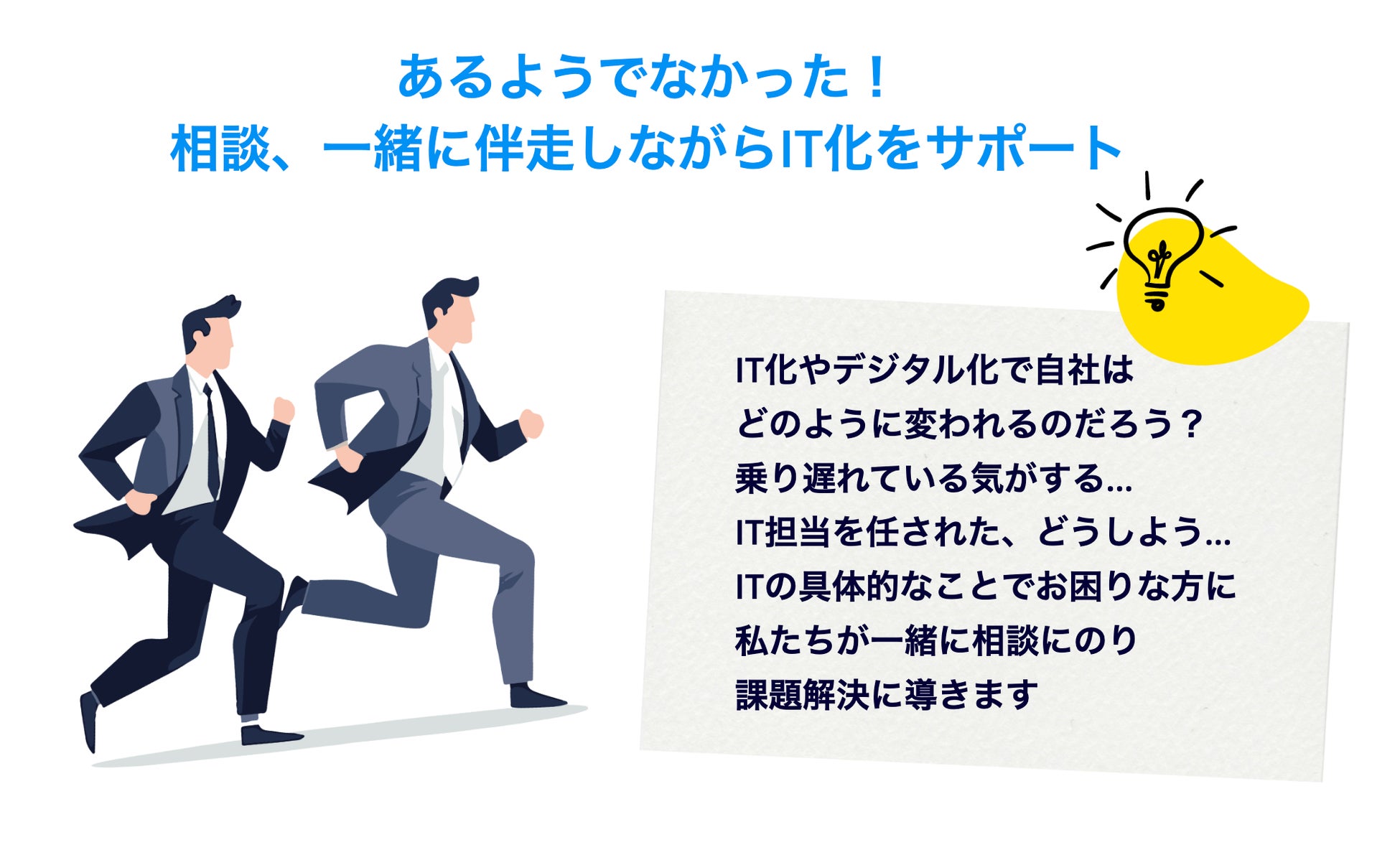 〜IT利活用の専門家が、経営者、情報システム・社内IT担当者、IT兼任担当者の悩みや課題に寄り添い、あなたの会社の伴走者として相談しながら二人三脚でサポート〜