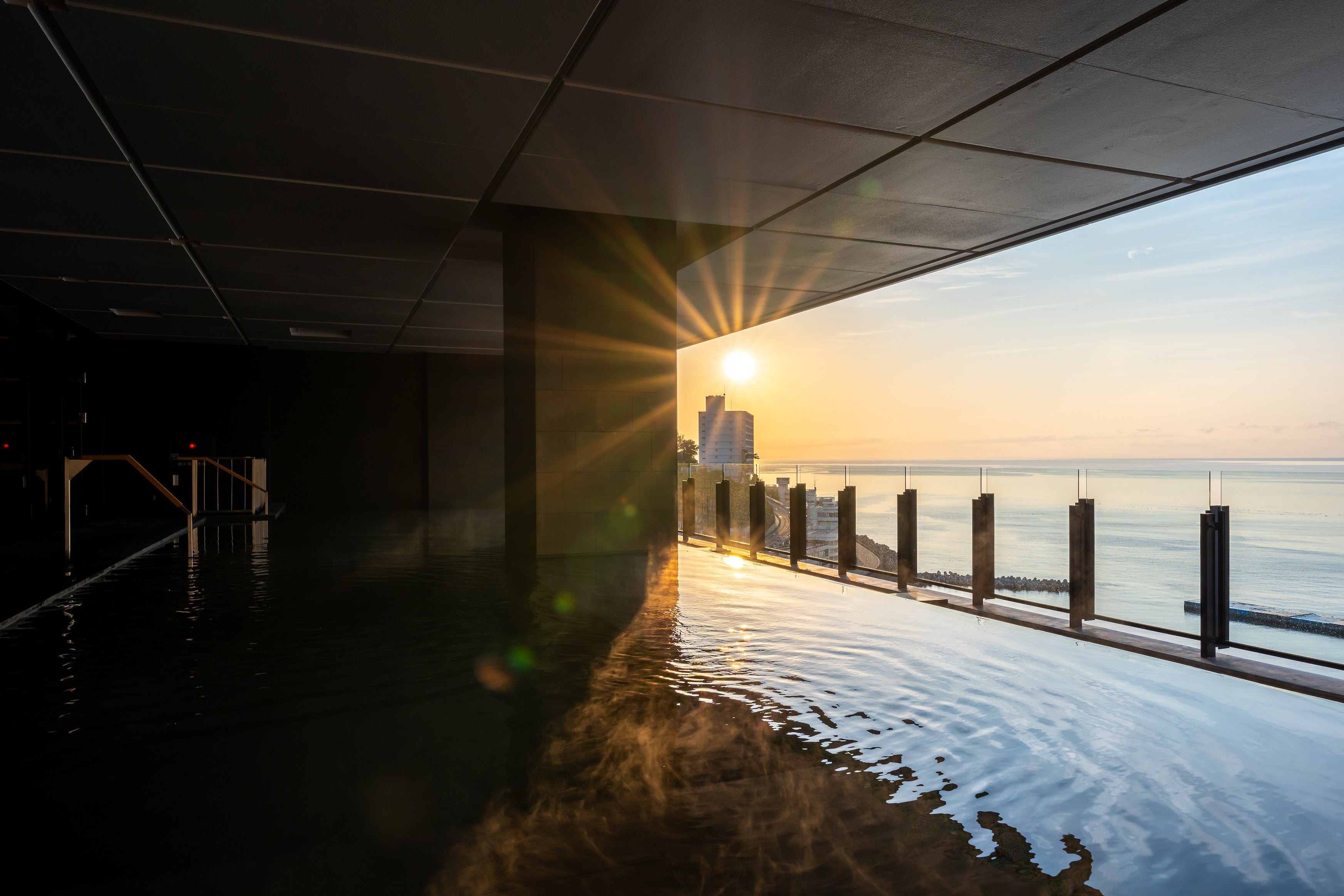 ホテル最上階(10F)にある全長12mのインフィニティバスは天空の船。海に向かってあふれ落ちる湯は熱海の海とつながり、そして空と繋がります。静かに湯に佇めば月写しの鏡に身をゆだねるひと時を体験できます。熱海温泉は、日本で2番目に多い塩化物温泉です。水素イオン濃度 PH 値 8.3、弱アルカリ性で海水の成分に似た食塩を含み、塩辛く無色透明の湯です。保温効果が高いため体の芯まで温まると共に、温泉成分のコーティング効果によって肌の乾燥を防ぎます。美人の仕上げとも言われており、「ツルツル&美白」の美白効果があると言われています。