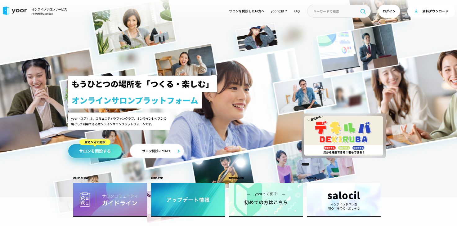 yoor(ユア)は、誰でも自由にオンラインサロンを開設できるサービスです。趣味のコミュニティやファンクラブ、オンラインレッスンの場として様々なオーナーがサロンを主宰しています。サロンのメンバーは、価値観が同じ仲間と交流を深める、新しい知識を学ぶなど、新しい体験が可能です。