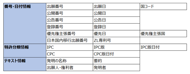 以下の書誌情報を取り込むことも可能ですので、公開番号や登録番号などをタイムリーかつ正確に把握することができます。