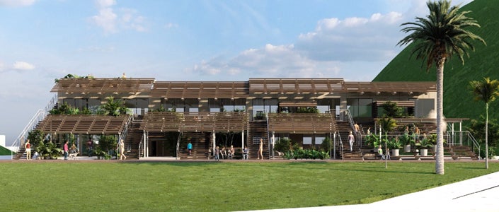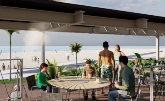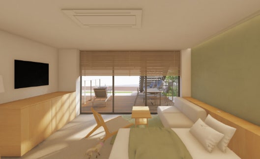 「そらすな」は、この長井浜公園に自らの投資により新設する鉄骨造2階建ての体験型宿泊施設で、延べ床面積は807.9㎡、客室10室にレストラン、会議室等を併設します。最大の特徴は、客室の海側を覆う巨大な木製の階段で、長井浜の海、砂浜と客室とをつなぎ、開放的であり、かつプライバシーを確保した空間を提供するところです。