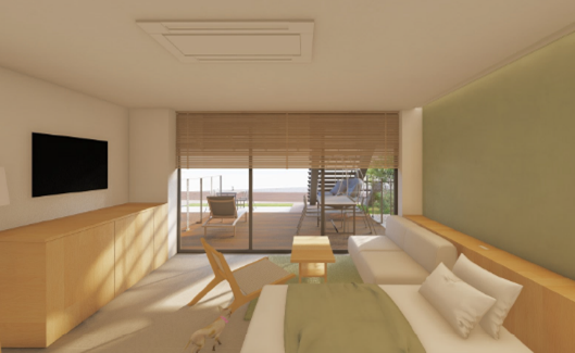 ①宿泊施設:8部屋(1室 30㎡程度)。オーシャンビューテラス付き。1部オーシャンビューバス・暖炉・サウナ付き。