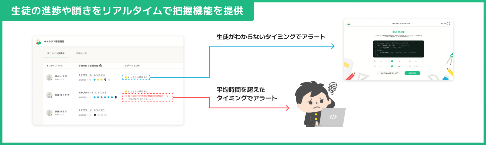 学習塾の生徒サポートが出来るように、生徒の躓きをリアルタイムでキャッチできるアラート機能を提供します。