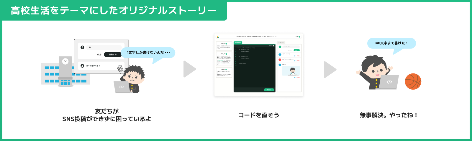 高校生活に関係があるテーマや身近にある困った事を「プログラミングで解決出来る」という認識を持って貰えるカリキュラムとなっています。