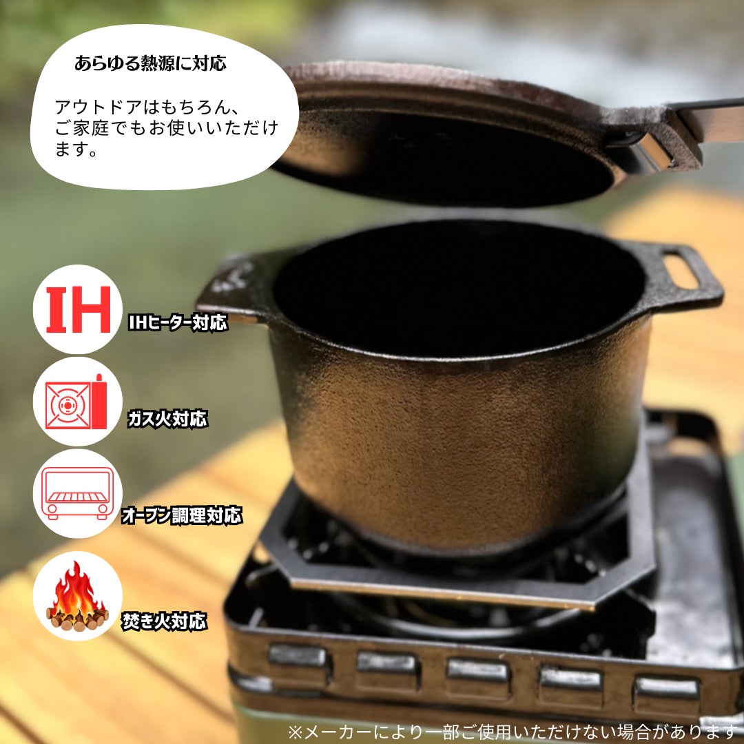ガス火だけでなく、IHヒーターや焚き火、オーブン調理にも対応していますので、アウトドアでもご自宅のキッチンでもお使いいただけます。