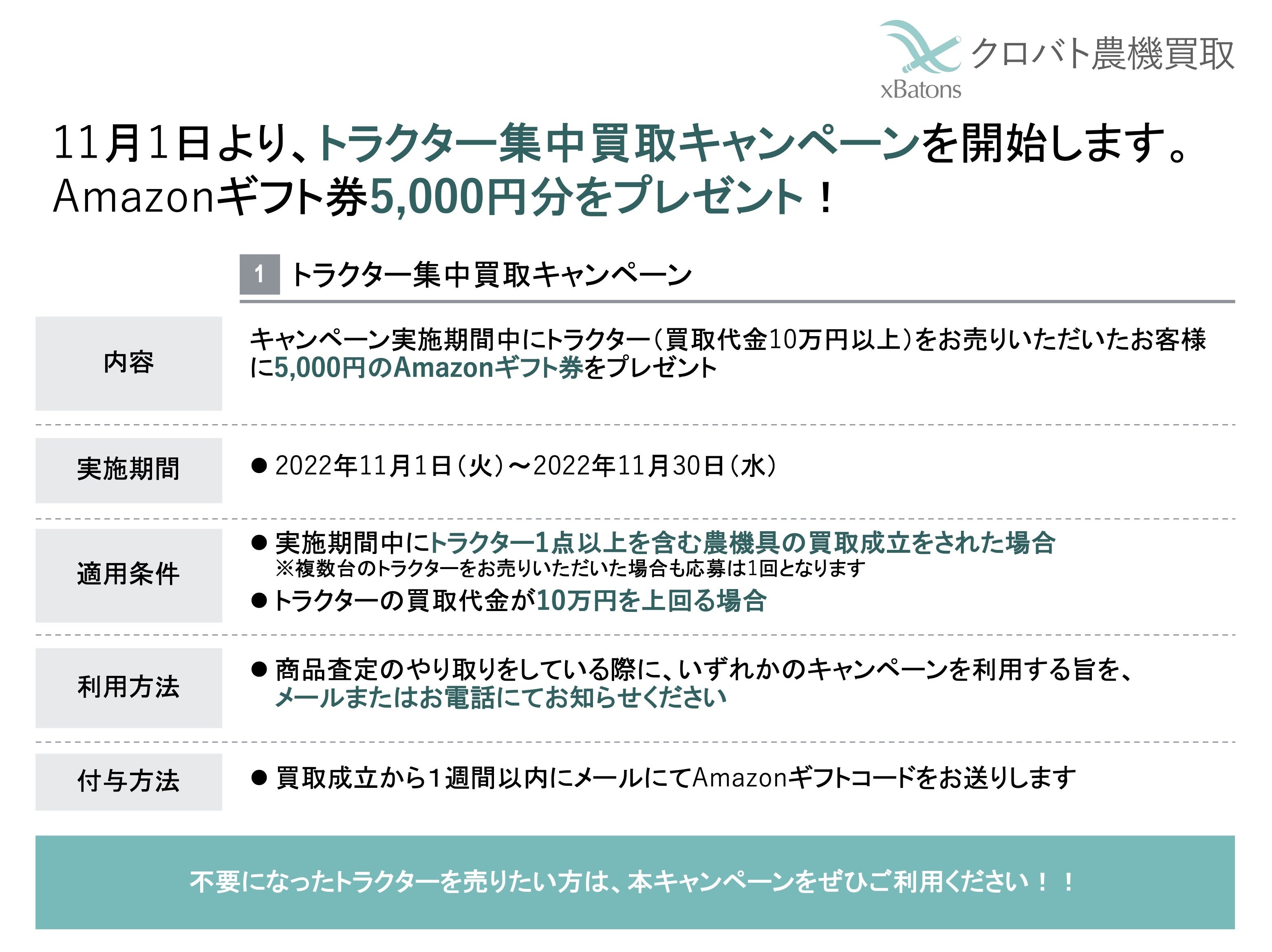 クロバト農機買取※では2022年11月1日より、対象のお客さまにAmazonギフト券5,000円分をプレゼントする、トラクター集中買取キャンペーンを開始します。